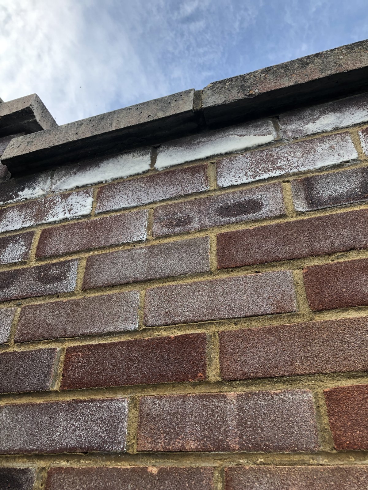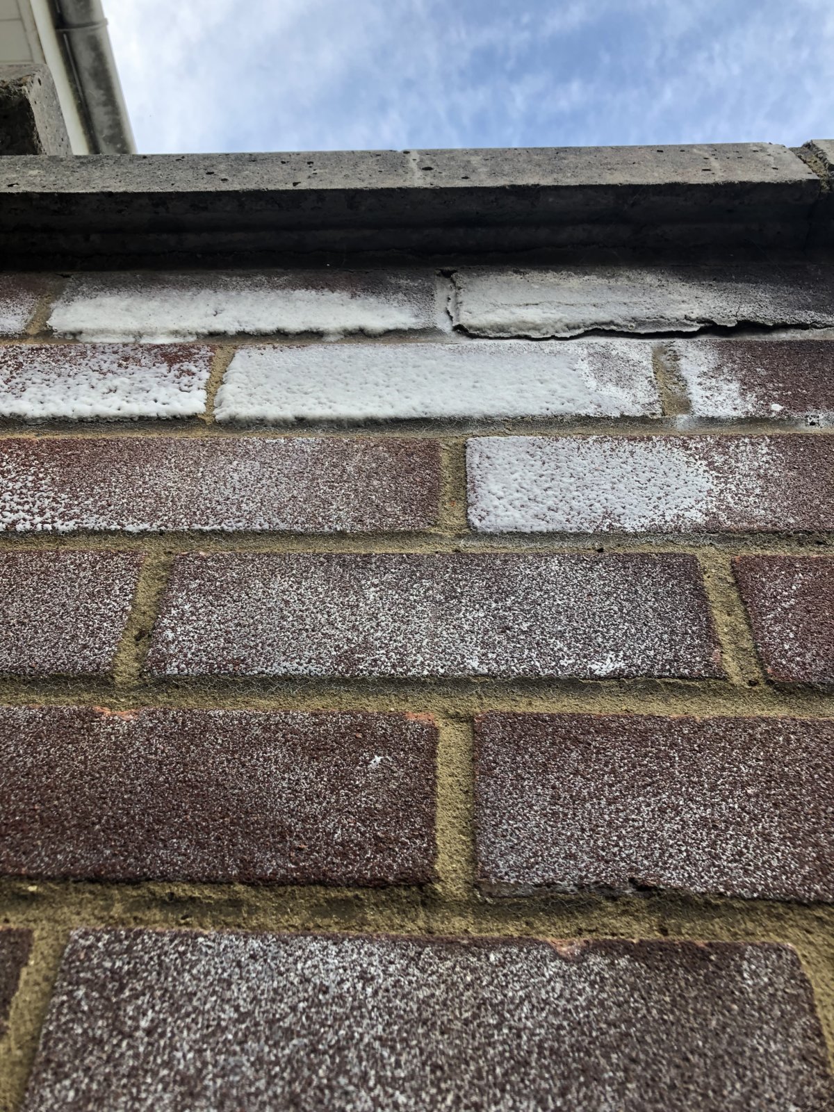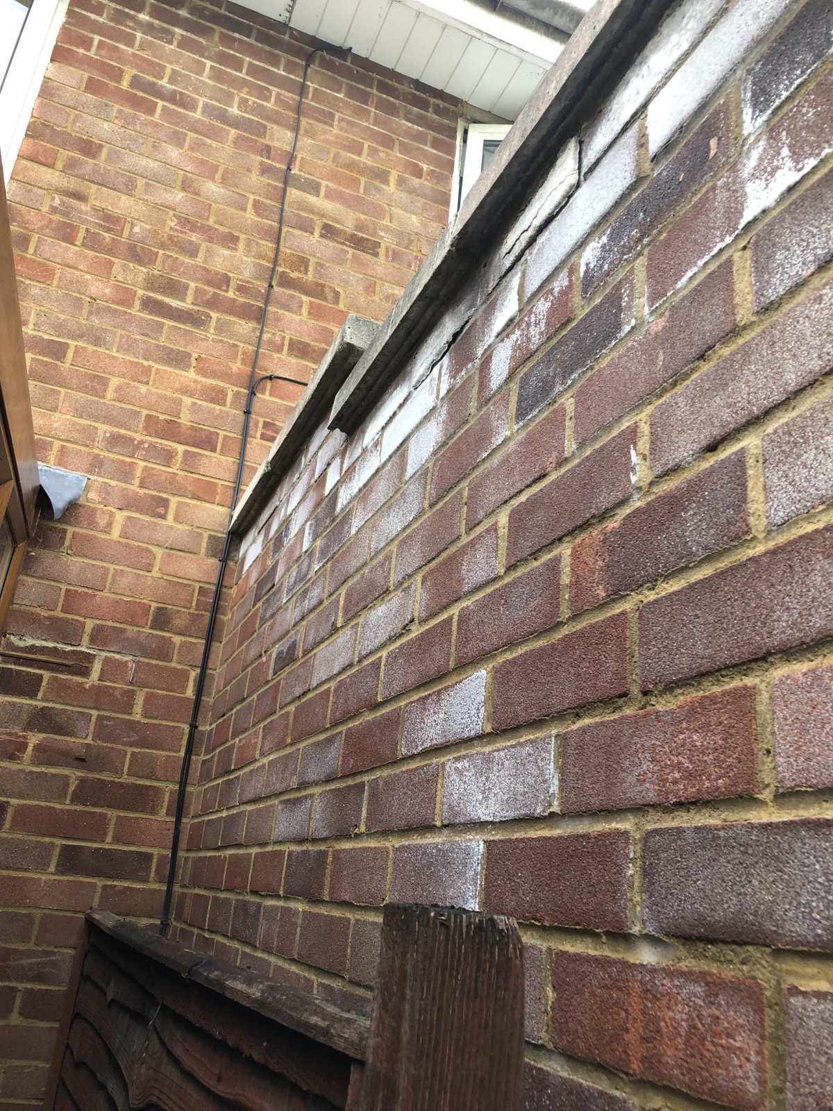 Hi please can someone give advice on the attached pictures the conservatory must be 20 years old at least and we moved in about 4 years ago. Since we have moved in this white stuff has appeared on the bricks and some are starting to spall. I have no idea what’s causing it! We use the conservatory and have a fish tank and sofa in there. Our neighbour says that it wasn’t there before we moved in so I don’t know if it’s just bad luck or something we have done such as the conservatory not being well ventilated? We do have the windows open during the summer but not the winter. I even wondered if the water from the fish tank is evaporating into the bricks somehow any coming out as salts the other side? The wall seems in good structural condition. A bit of repointing is required at the top where the slabs join the bricks but I can’t see it causing it to that extreme. It’s only at the top of the wall and a bit less extreme in the middle but seems to be getting worse. You literally can’t brush it off either! Any ideas please?