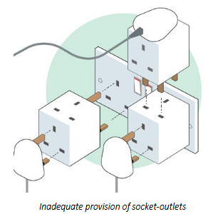 Eg In the example of extension leads, whilst a property may require extension leads to function, sockets are never where you need them, it is a contractual item, whilst a sparky could note that many extension leads are being used by a tenant, that is a contractual issue between the landlord and tenant, most new contracts contain clauses as to the use of sockets ie 1 appliance per wall socket, extension leads where used must be single socket extensions etc etc. it is up to the landlord and tenant to specify how the property is used, as failure to keep to the contract is grounds for remedy.