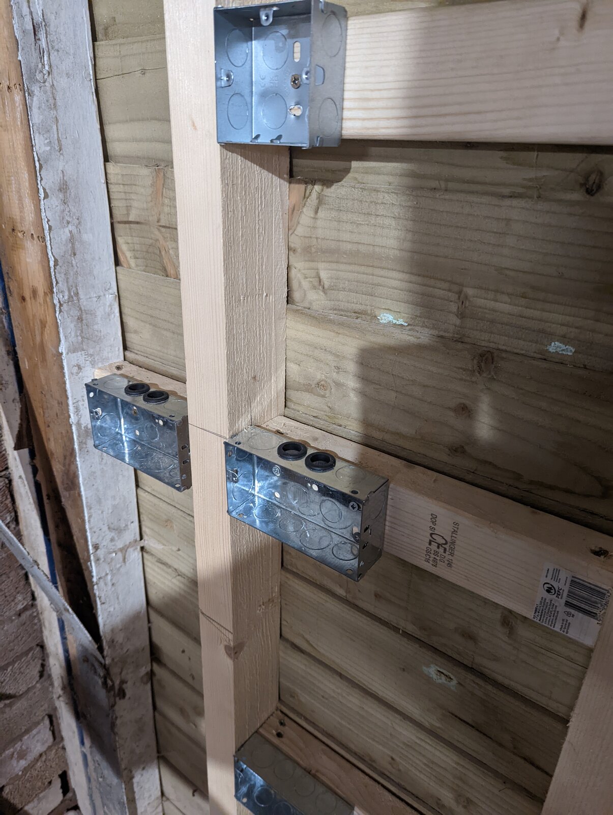 For 3 out of the 4 garage walls I will be able to use a void behind the insulation boards to run cables and have them come through the back of my back boxes which will be fixed to noggins.