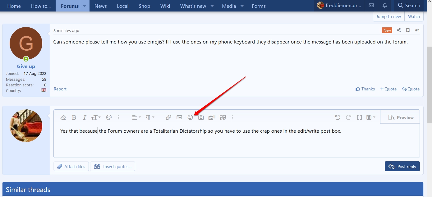 Yes that's because the Forum owners are a Totalitarian Dictatorship so you are forced to use only the crap ones available in the edit/write post box, click on the crappy smiley face and choose what you want. Even then they seem to randomly get inserted not where you want them.