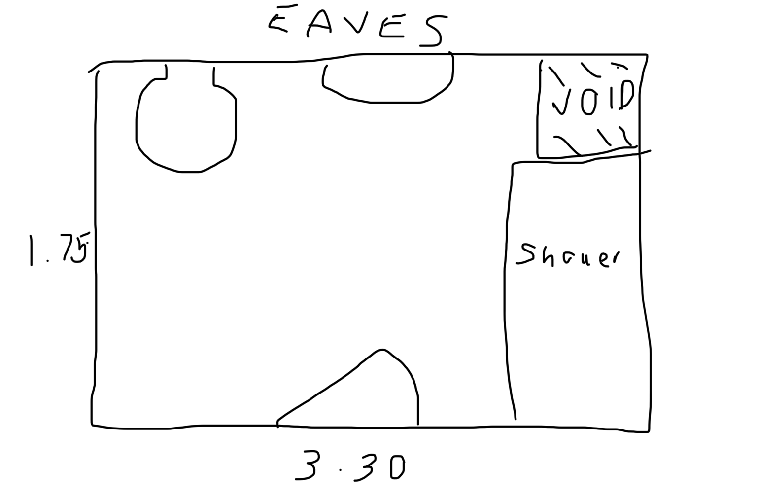 Room is 1.75m wide x 3.3m long x 2.35 high. Along the long wall the ceiling slopes for about half the width of the room taking the height down to 1.8m. No windows.