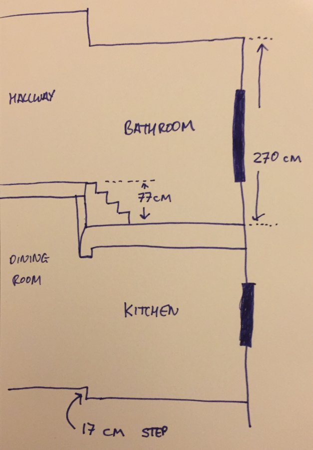 I live in a victorian house which has a kitchen on the ground floor at the back of the house, and a bathroom directly above it. Both rooms have steps going down into them. I've attached a drawing to illustrate. Each room is about 3 x 2.5m.