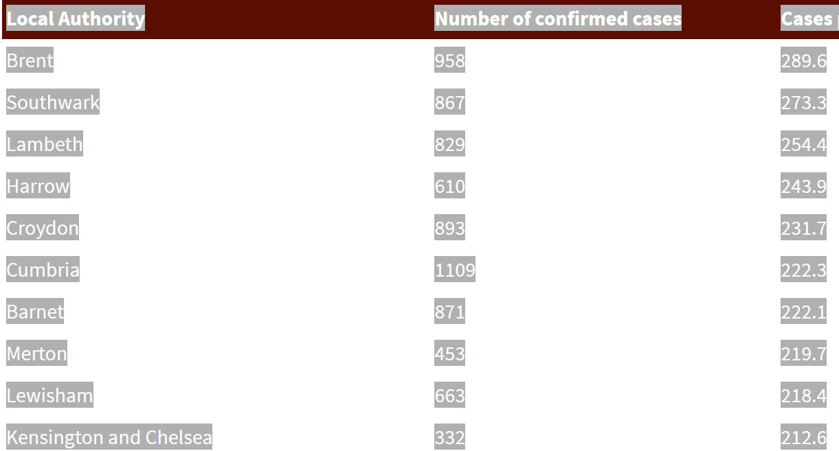Etnic minorities also tend to live in urban areas, which are worst hit ,take Brent (near 1000 cases) for example only 15% white British.