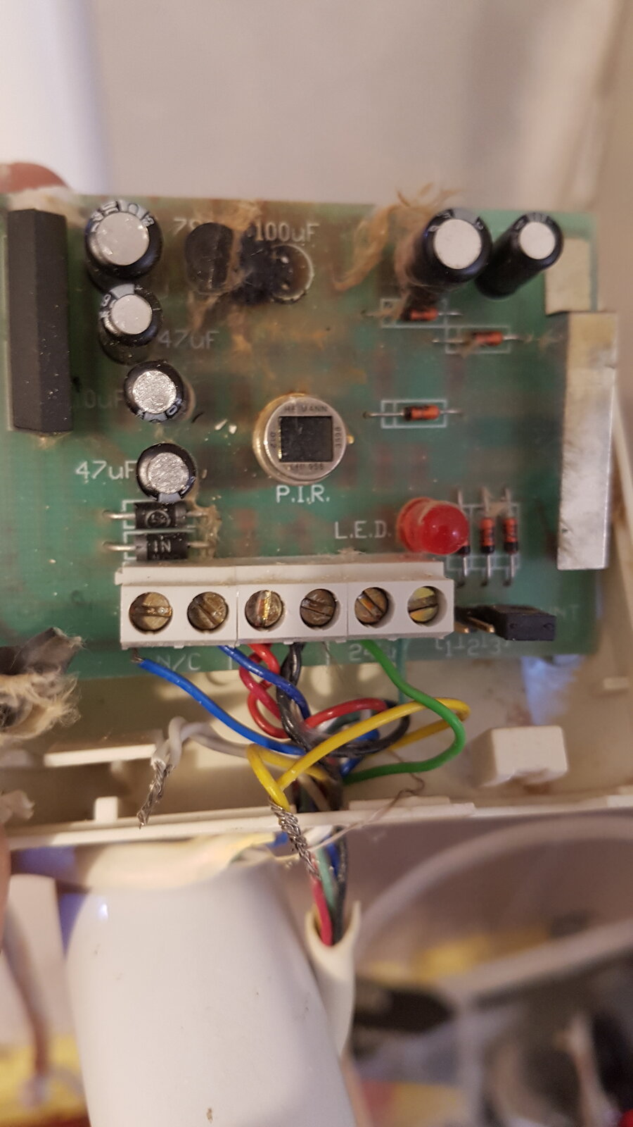 Anyhow, one zone has 3x pir in series. The middle pir had a delaminated capacitor that fell out whe I took the case apart. Burn marks in the case