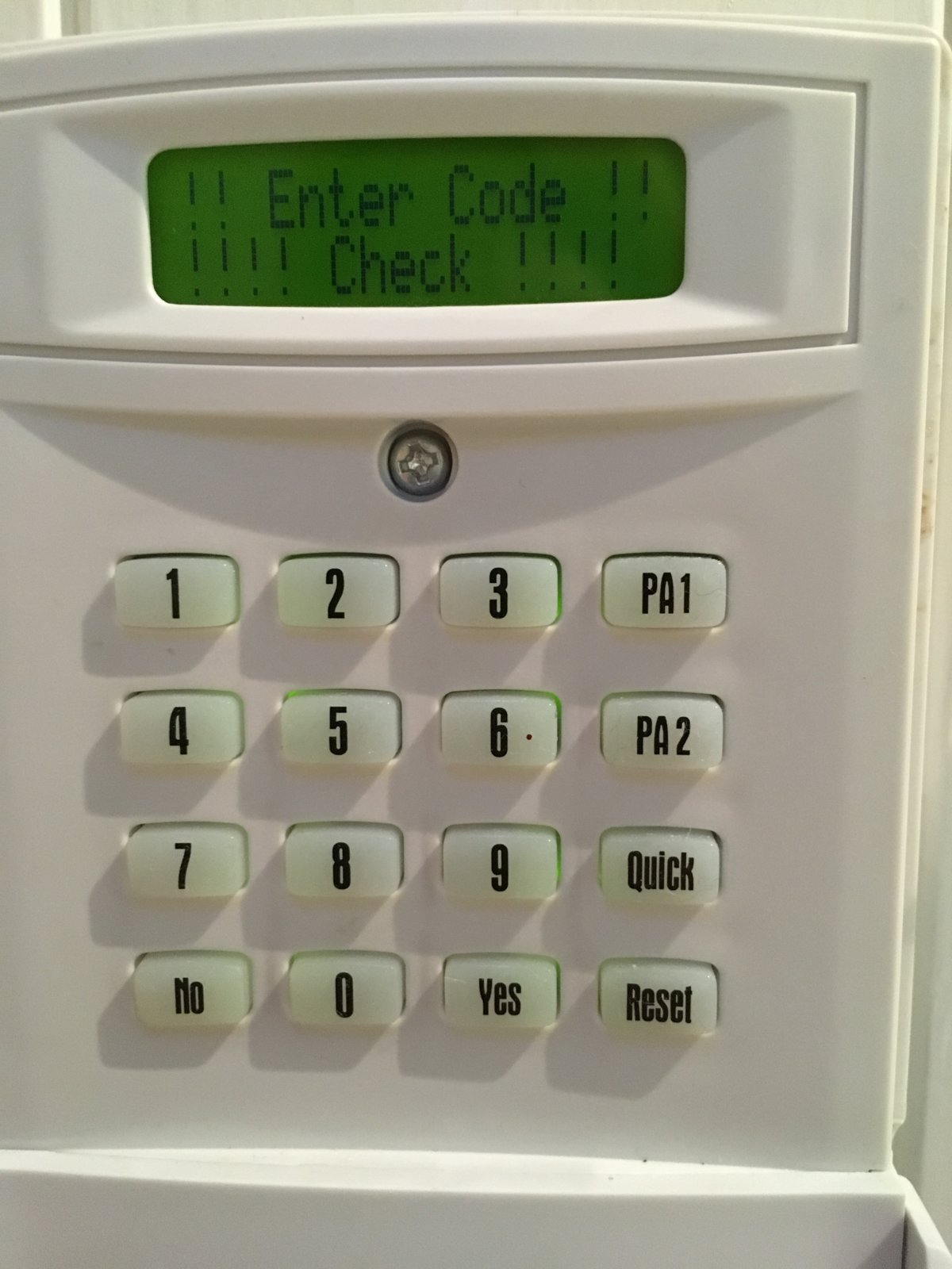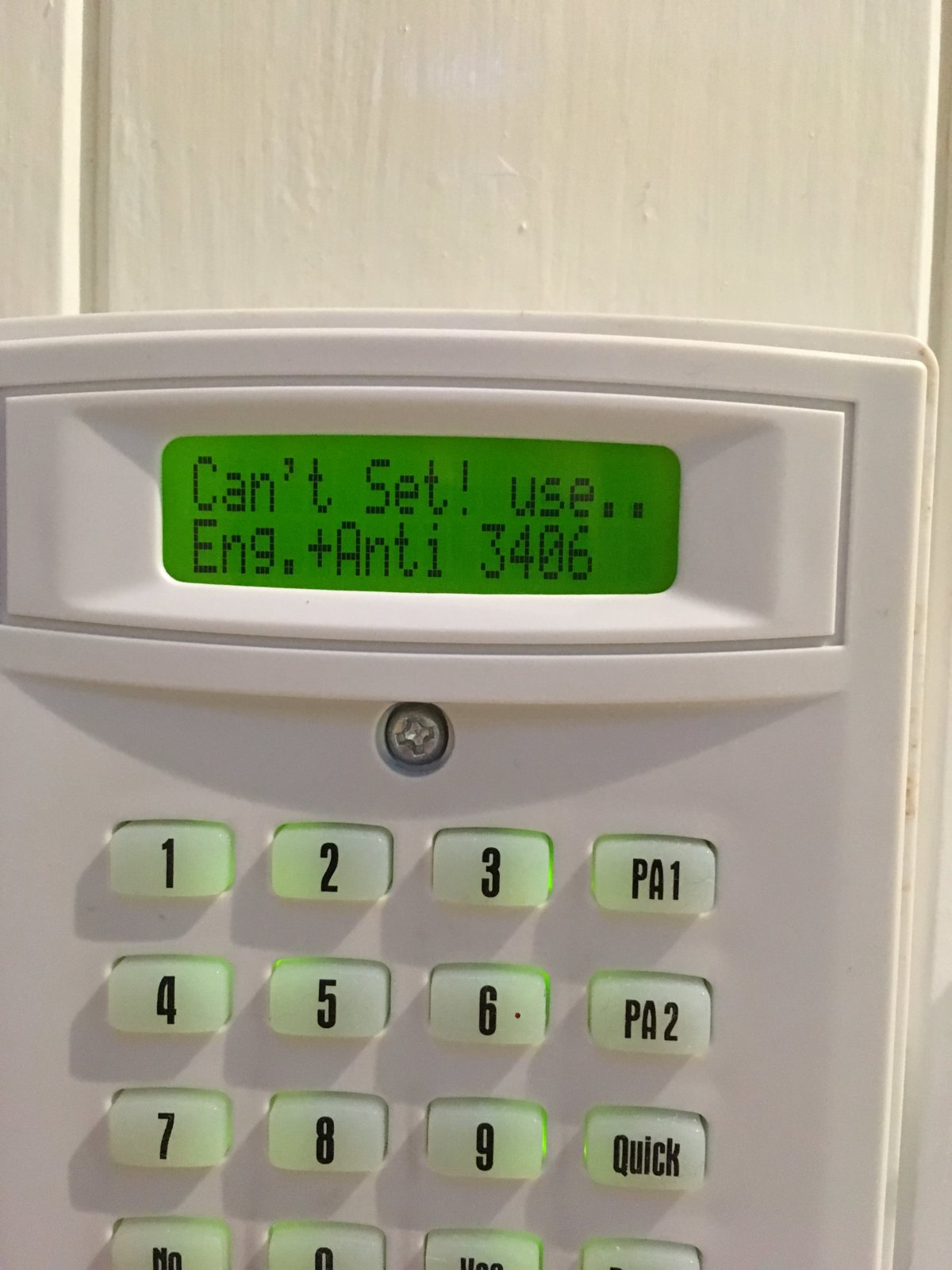 Hi I have recently moved into a house with this alarm installed. I have changed the user code etc. When decorating the living room I thought I might be able to remove the motion sensor to take the wallpaper off behind it. I removed the front cover which triggered the alarm but input my code straight away. The lcd screen is now showing the message in the first picture and when I enter my code and press reset I get the second screen. Any ideas what I need to do. Thanks in advance.