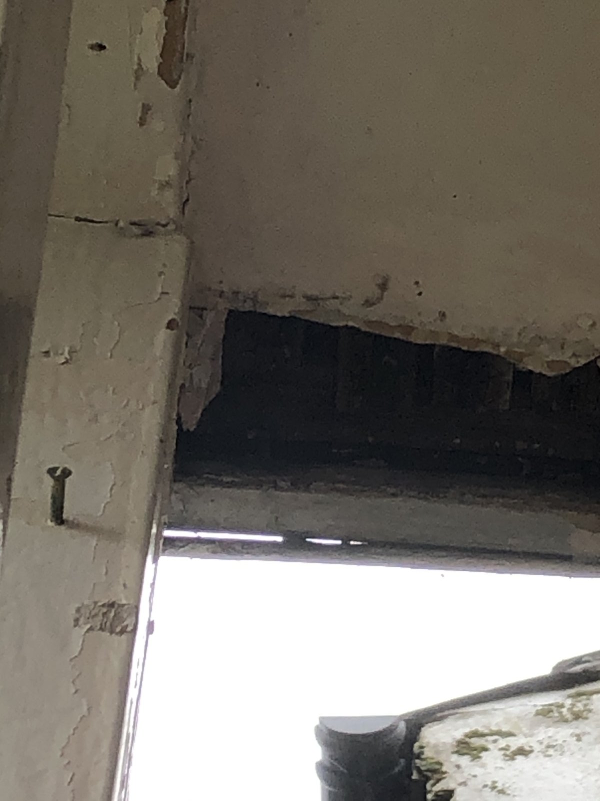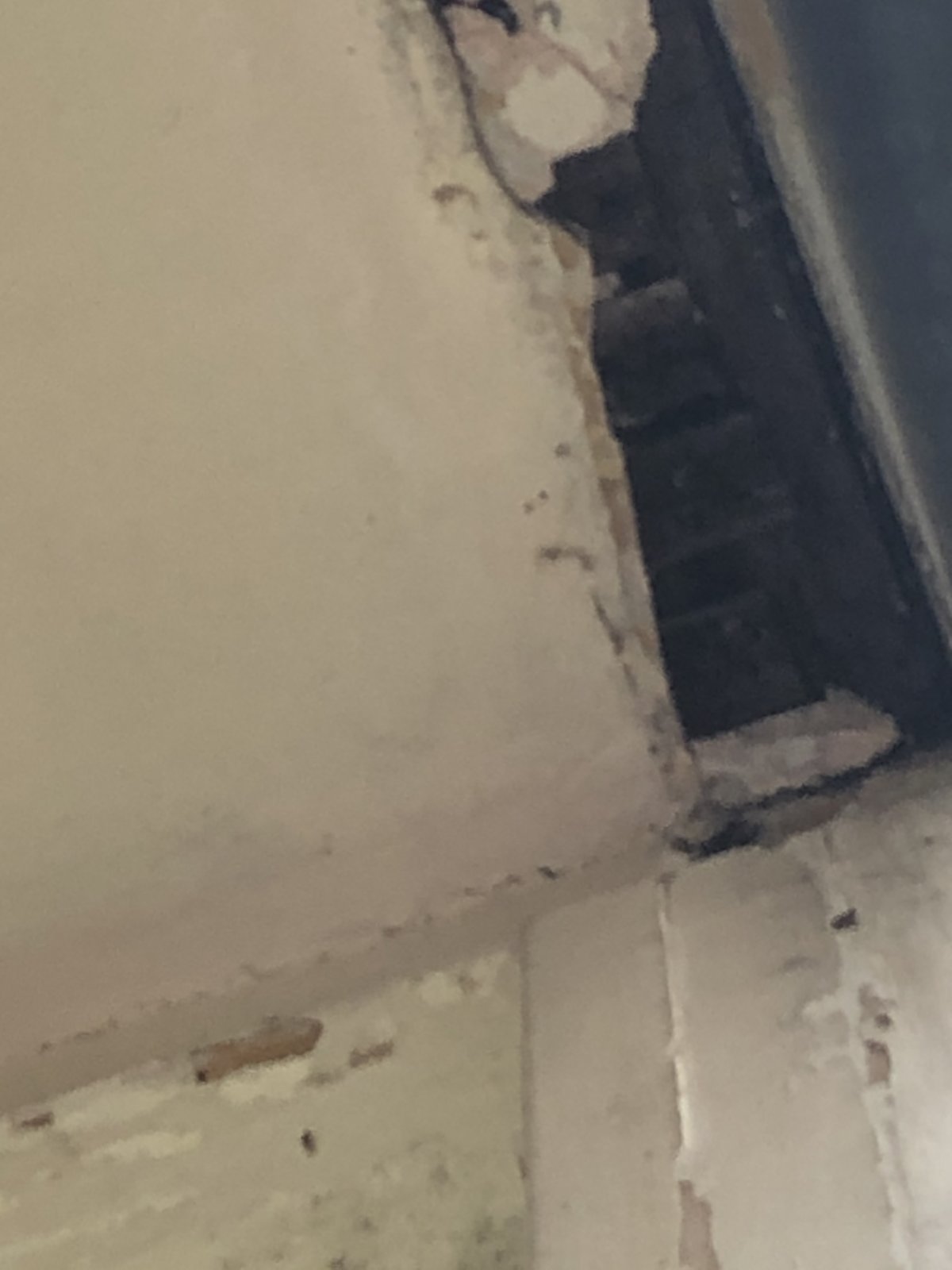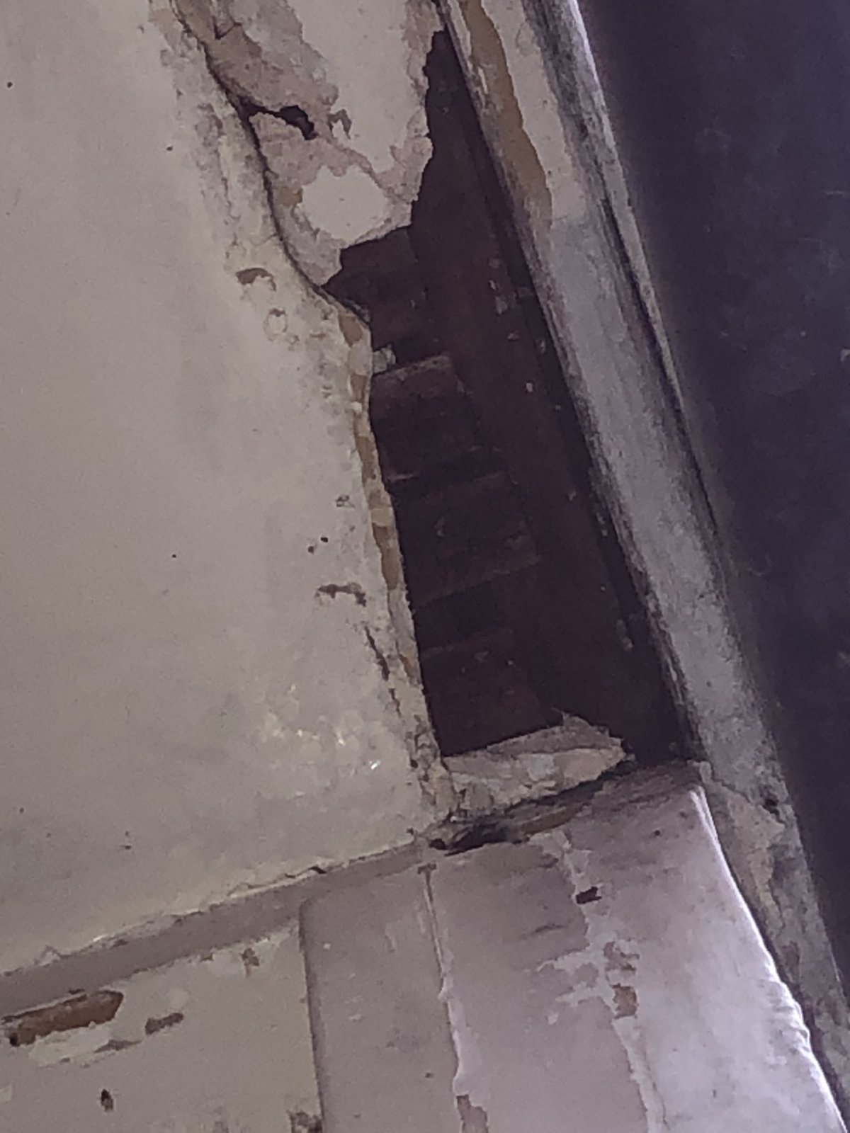 We have just removed our rotting 1970s wooden porch frame from front of 1918-built semi. Mostly good; however, now small gap in ceiling and lathes exposed. This was previously “inside” as inside porch. Obviously patched in recent decades with gypsum-based plaster as repair now evident.