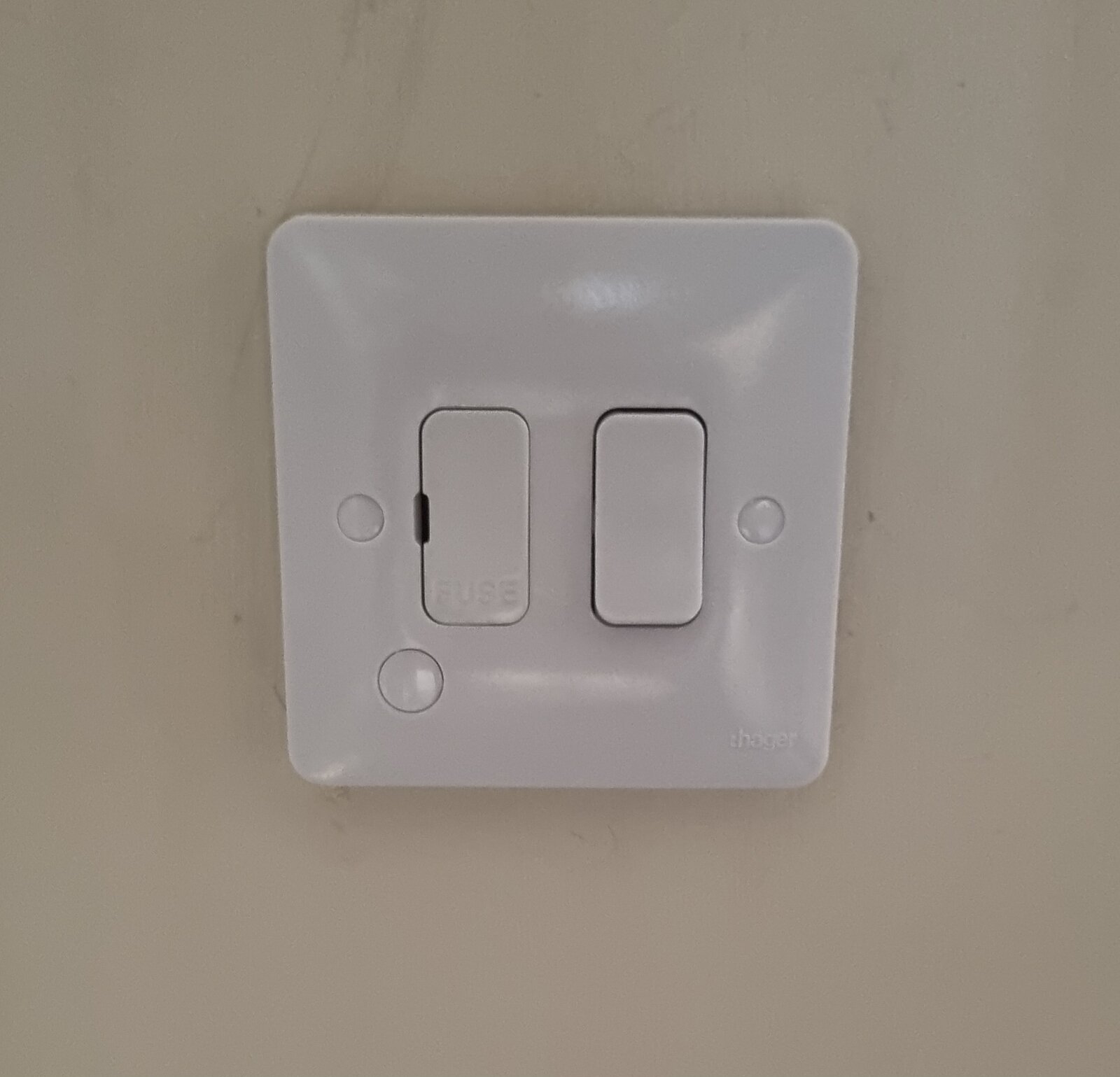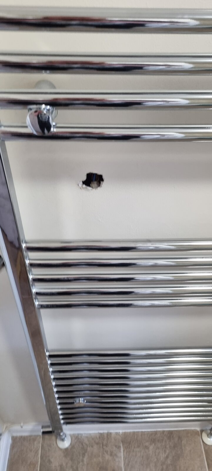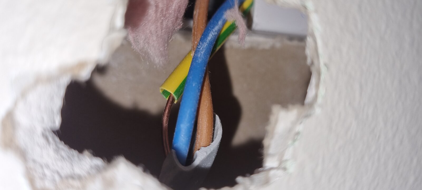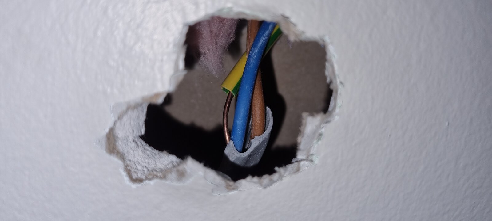 We have had an electric towel rail installed, and our electrician has left this hole in the wall for us to patch up. The wires seen in the hole are connected to a newly installed fused spur which has been connected via an existing socket at the other side of the plasterboard.