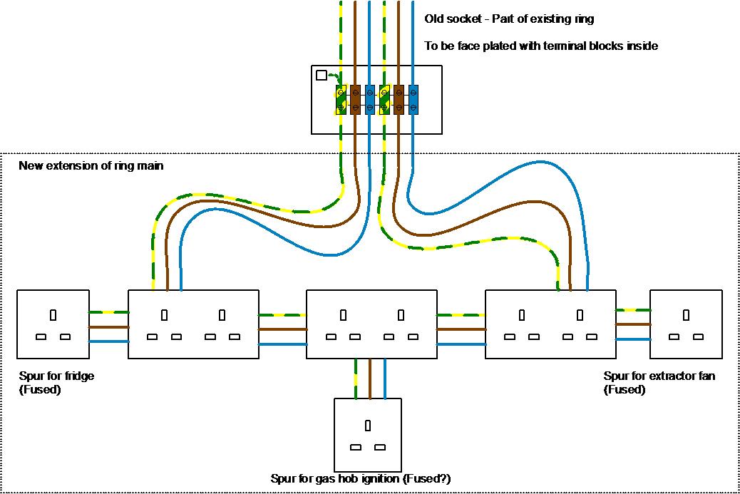 As the image shows, I would like to have the ring main extended by using an unused double socket. 32A terminal blocks inside the socket box wieth a fac plate on the front to cover it all off.