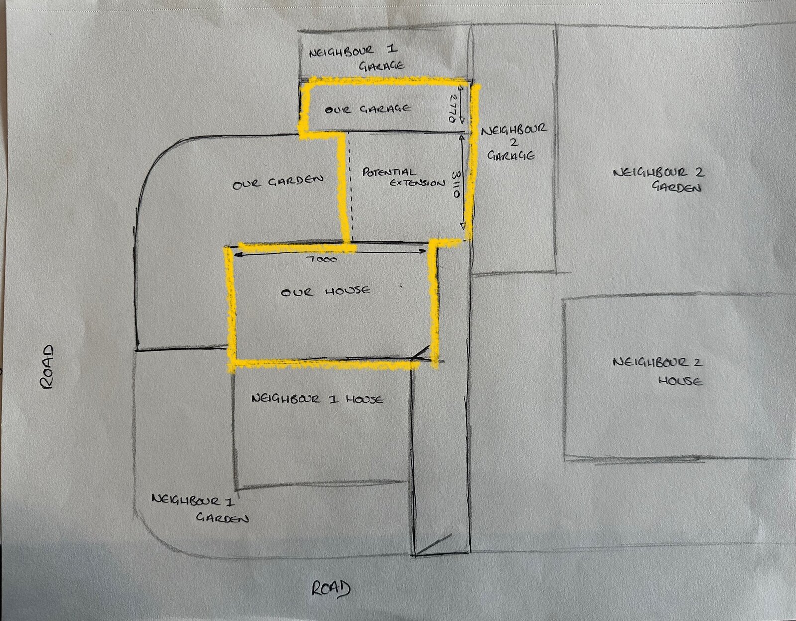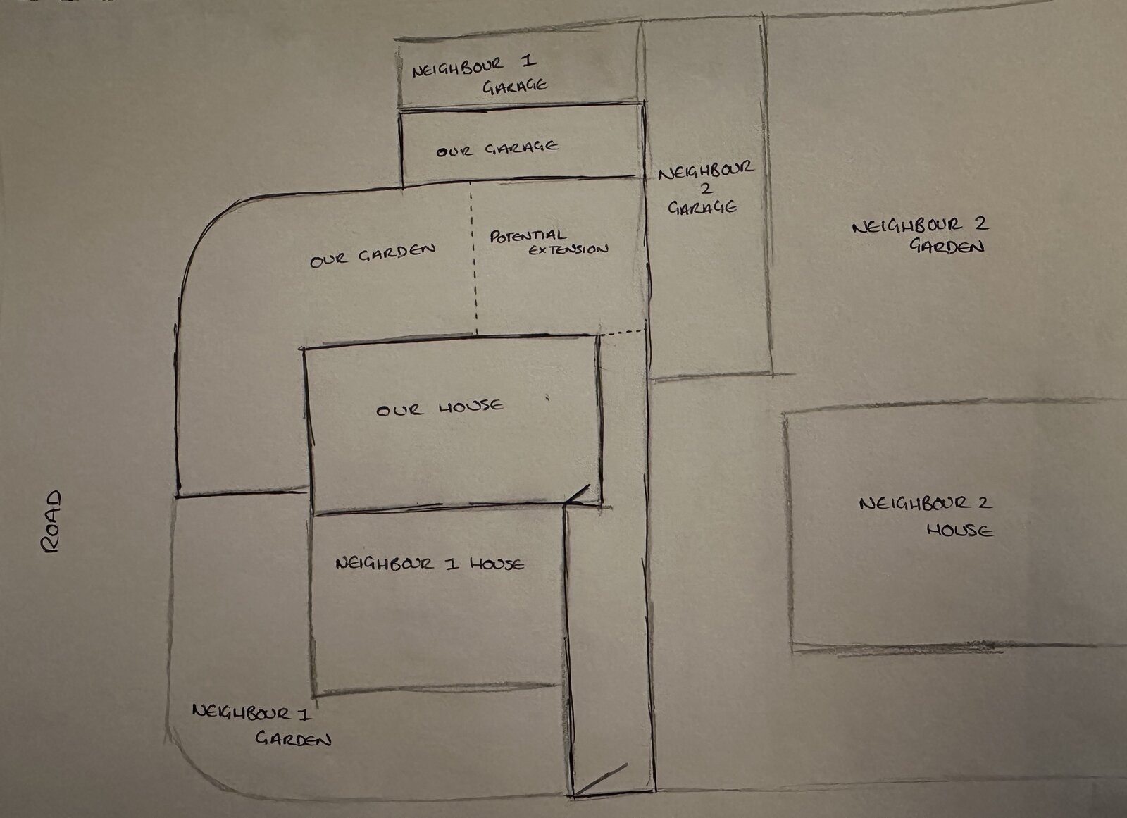 The council have said our only chance to extend would be as shown by the dashed line on the drawing. This would mean the extension would need to be built against neighbour number 2’s garage wall and incorporate our garage which is attached to neighbour number 1’s garage.