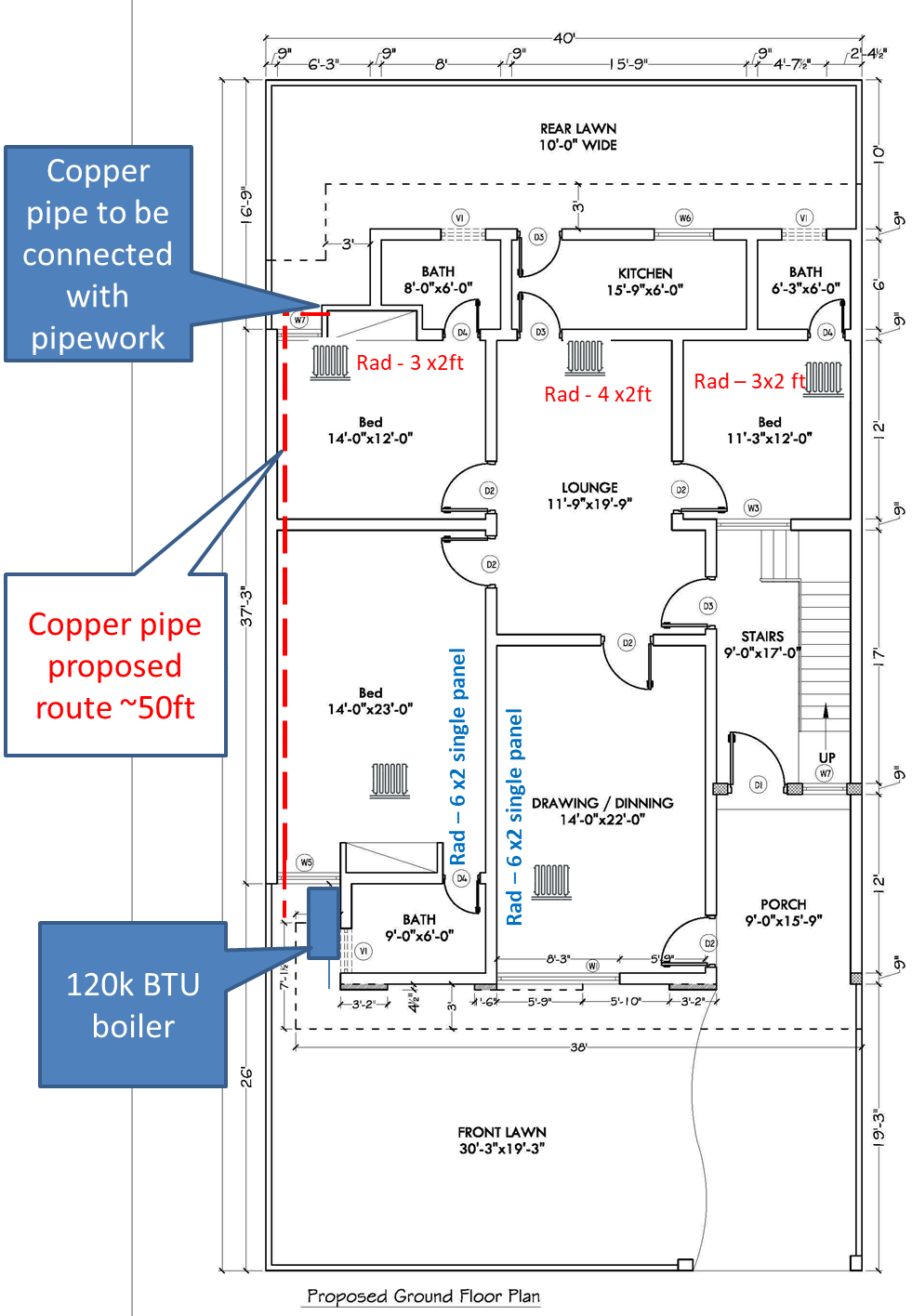 I am on my learning curve with the system and my heat calculation tells me that the front 35kw boiler would be enough with 12 radiators in total for the whole house including small radiators in bathrooms. To do this I need to extend the pipework from front to back; two copper pipes 22mm for 35ft length.