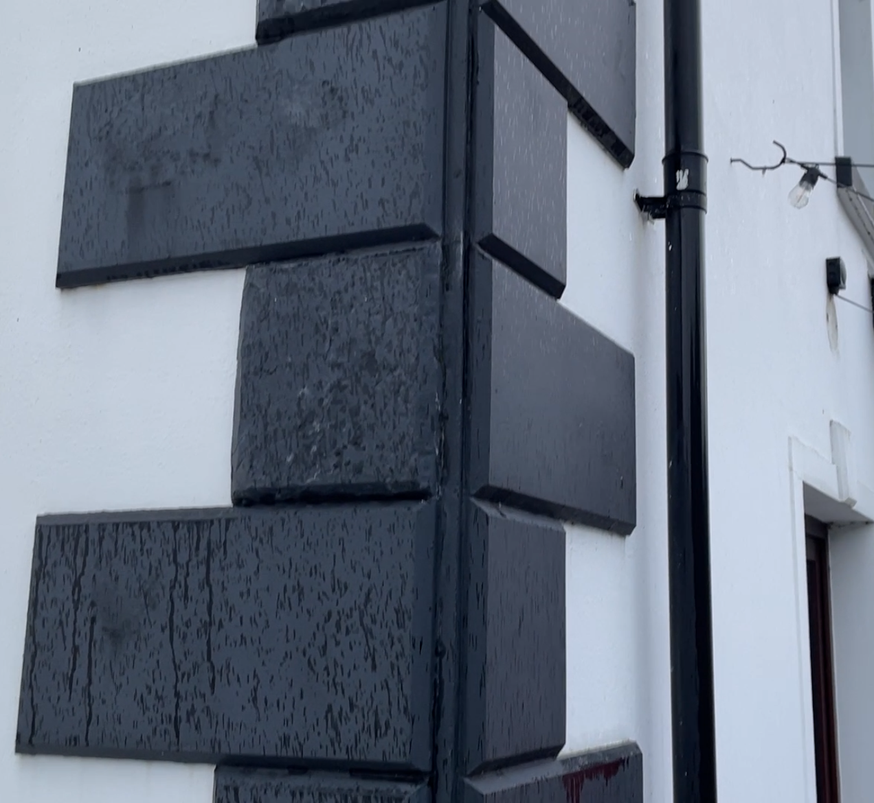 At some point in the past, someone applied a sealant to the horizontal and vertical gaps between the corner blocks. However, the sealant is now deteriorating and peeling away, allowing water to seep in behind.
