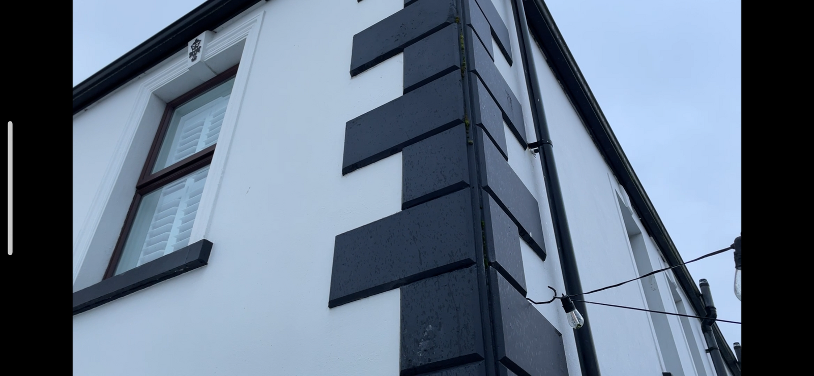On the exterior of my house, there are decorative corner blocks designed to create a corner effect. However, instead of being a single, continuous piece wrapping around the corner, they are separate pieces on each side, leaving a small gap that exposes the actual corner of the house.