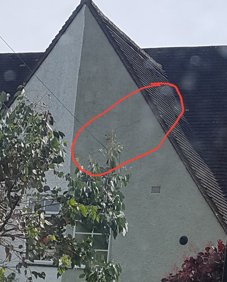 The survey hasn't been done yet but have noticed this on the second viewing. The house is 88 years old and it's up near the roof in the plaster work. What concerns me about it is it looks like it might continue into the cement on the edge of the roof tiles.