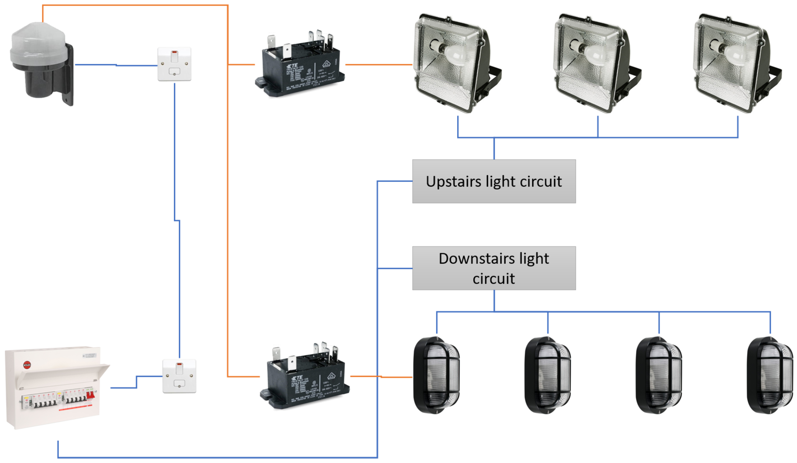 The photocell is the switch to the two relays/contactors, which in turn switch the upper sodium lights and lower bulkhead lights around the outside of the property. Power to the upper and lower lights comes from the upstairs and downstairs light circuits respectively.