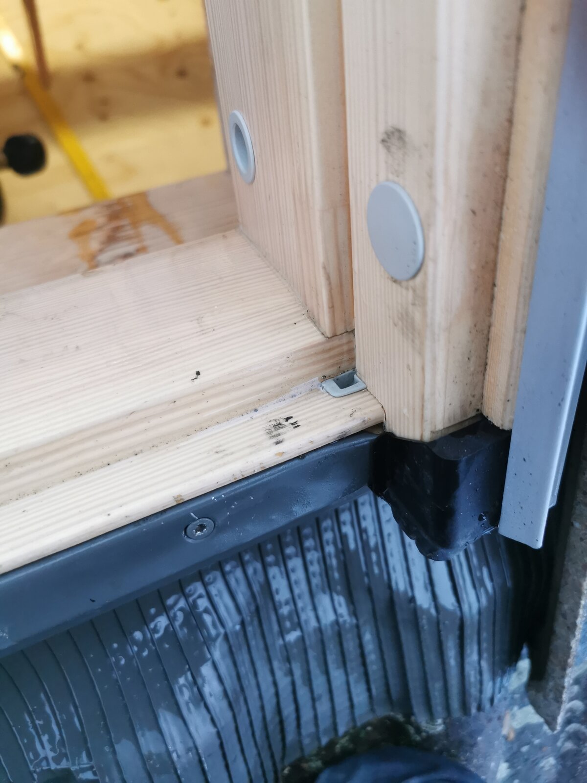 The left seems to get in at the joins in the flashing half way up and again seems to get past the seals and drips off the inside of the bottom into the room.