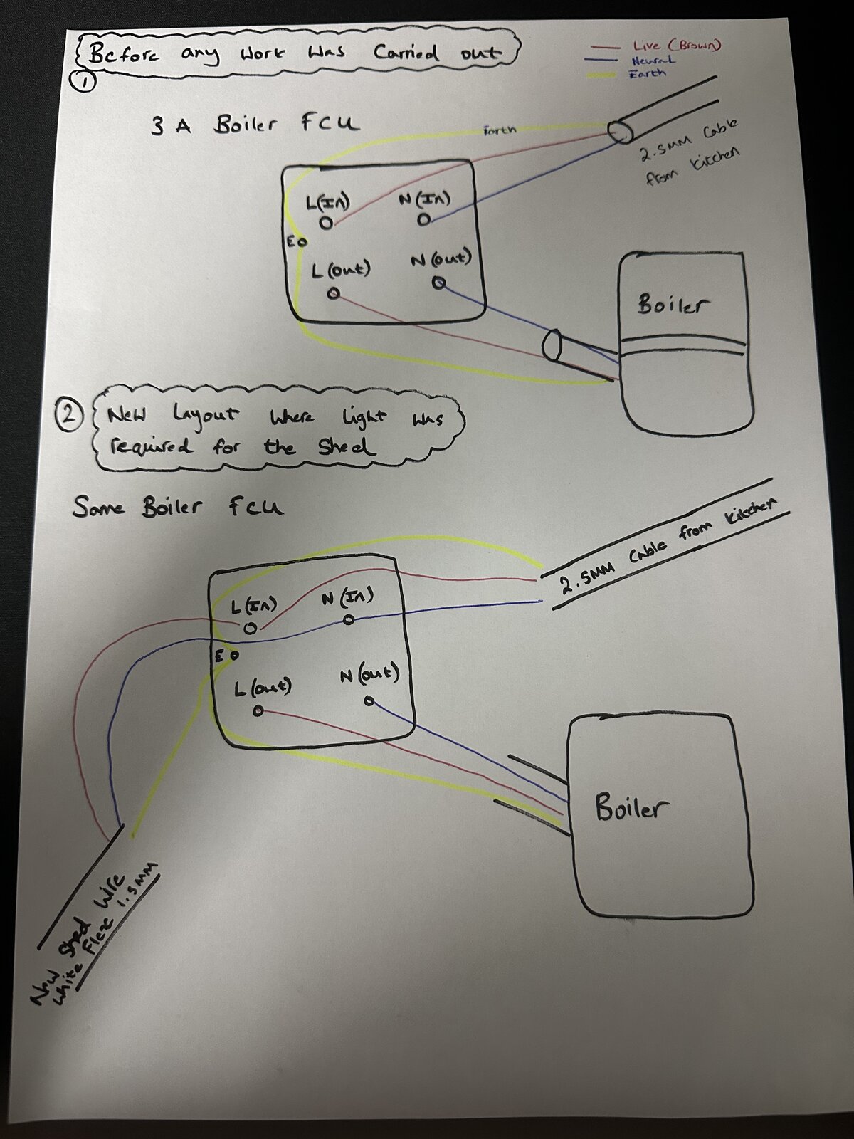 @pete01 - The supply came from one of the kitchen sockets into the 13A fcu. What left from that 13A fcu is two cables, one going to the shed, and the other going into another 3A fcu (boiler one)….obviously that supplies the boiler.
