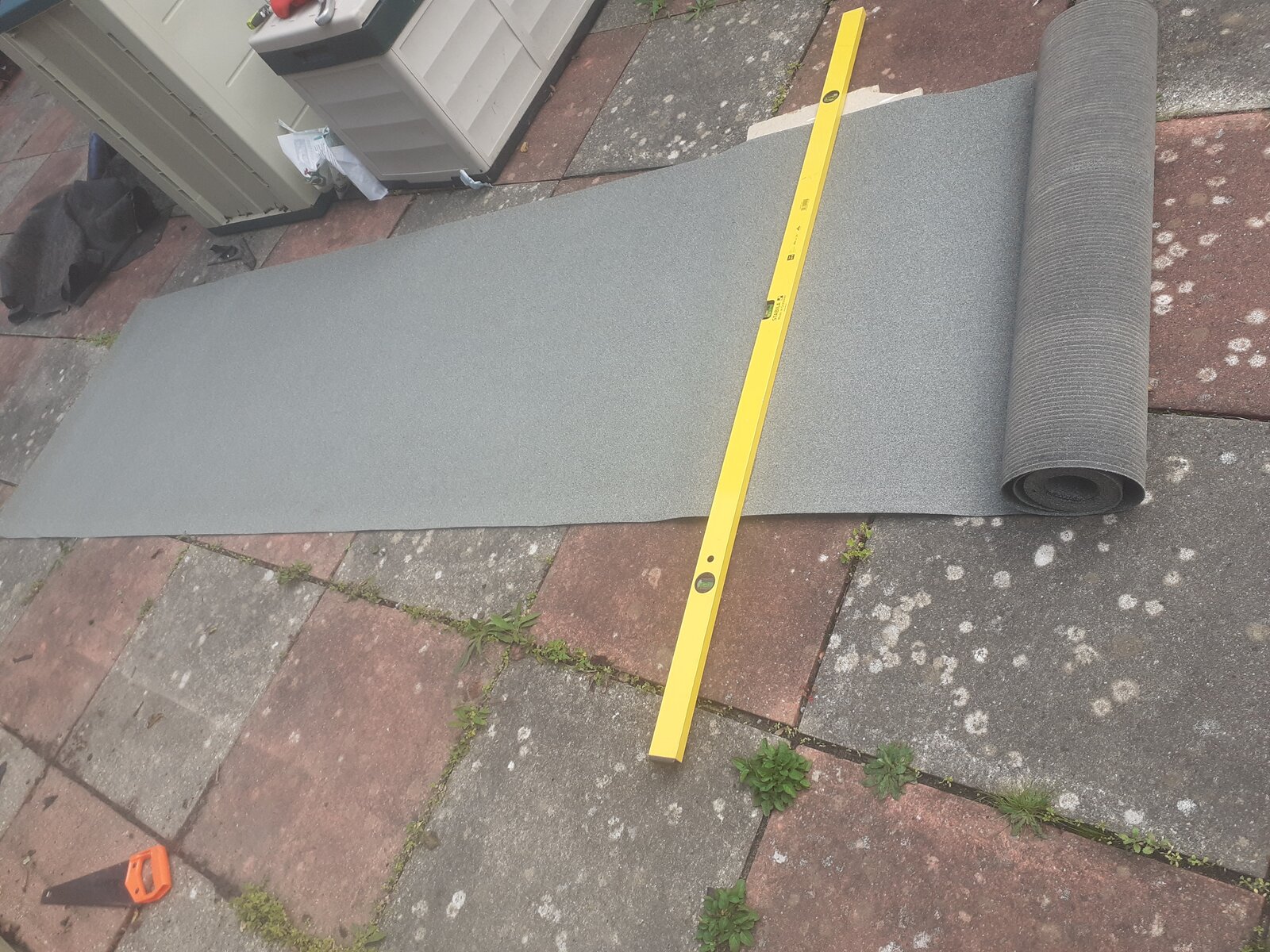 Measured roof then cut to length rather than rolling whole roll, found when I tried to line up with baton along both sides it kept sliding off so just put couple of tacks in at top.
