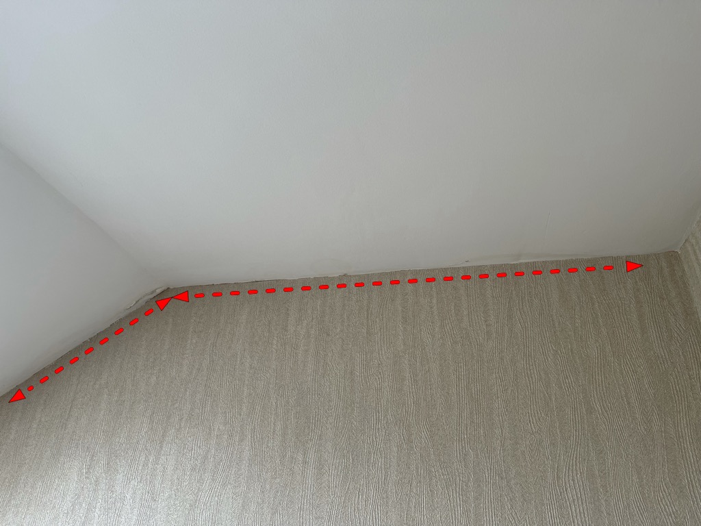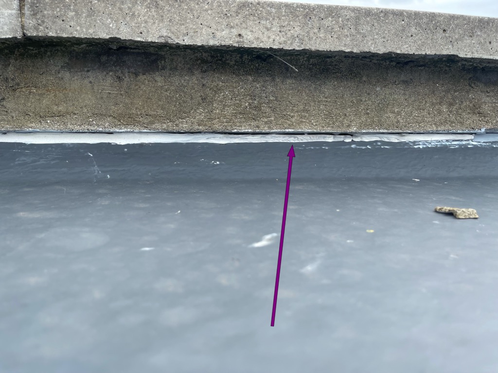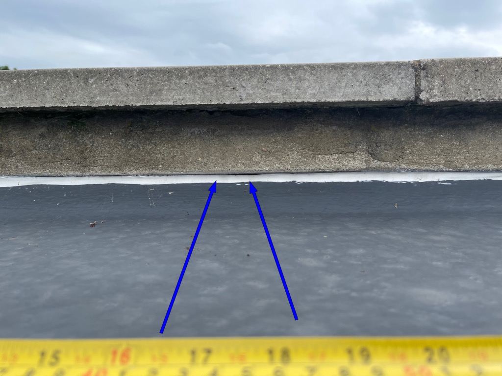 The issue I have is water is seeping at the edge of the roof and on to the walls and ceiling inside. See attached picture with red dotted lines in which you can see water marks on the ceiling and the area of the leak. I have included another picture with the roof area directly above this. It’s the picture with yellow dotted lines and measure tape.