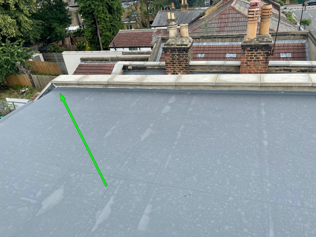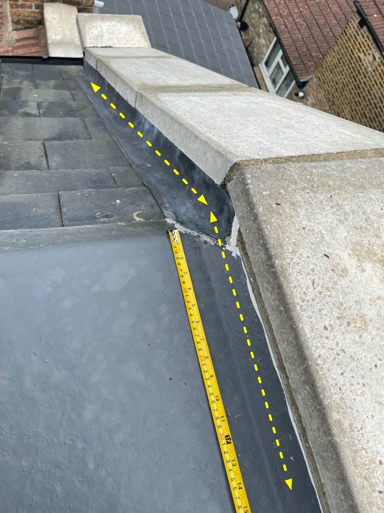 It appears to me that water on the flat roof is running towards the back of the roof and possibly getting through under the lead (where lead meets the roof). However, internally the water mark damage is showing to be starting from at least 3 feet before the sloping part of the roof. It is then possible that water is also seeping through the small gaps between the roof where it terminates and the party wall? These gaps have got silicone in it but it appears it has not stuck well in places where it was previously bonding to fibre glass.see attached picture with arrows marked blue and purple.