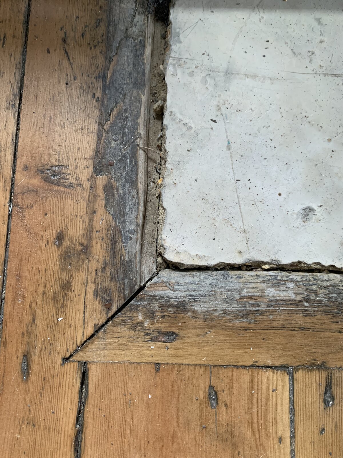 The photo shows a gap between floorboard trim and old concrete hearth edge. The floorboard trim is tatty and slopes down - so we need to cover the wood trim and make level with the concrete so it’s smooth for the rug to lay over it without a dip/bump.