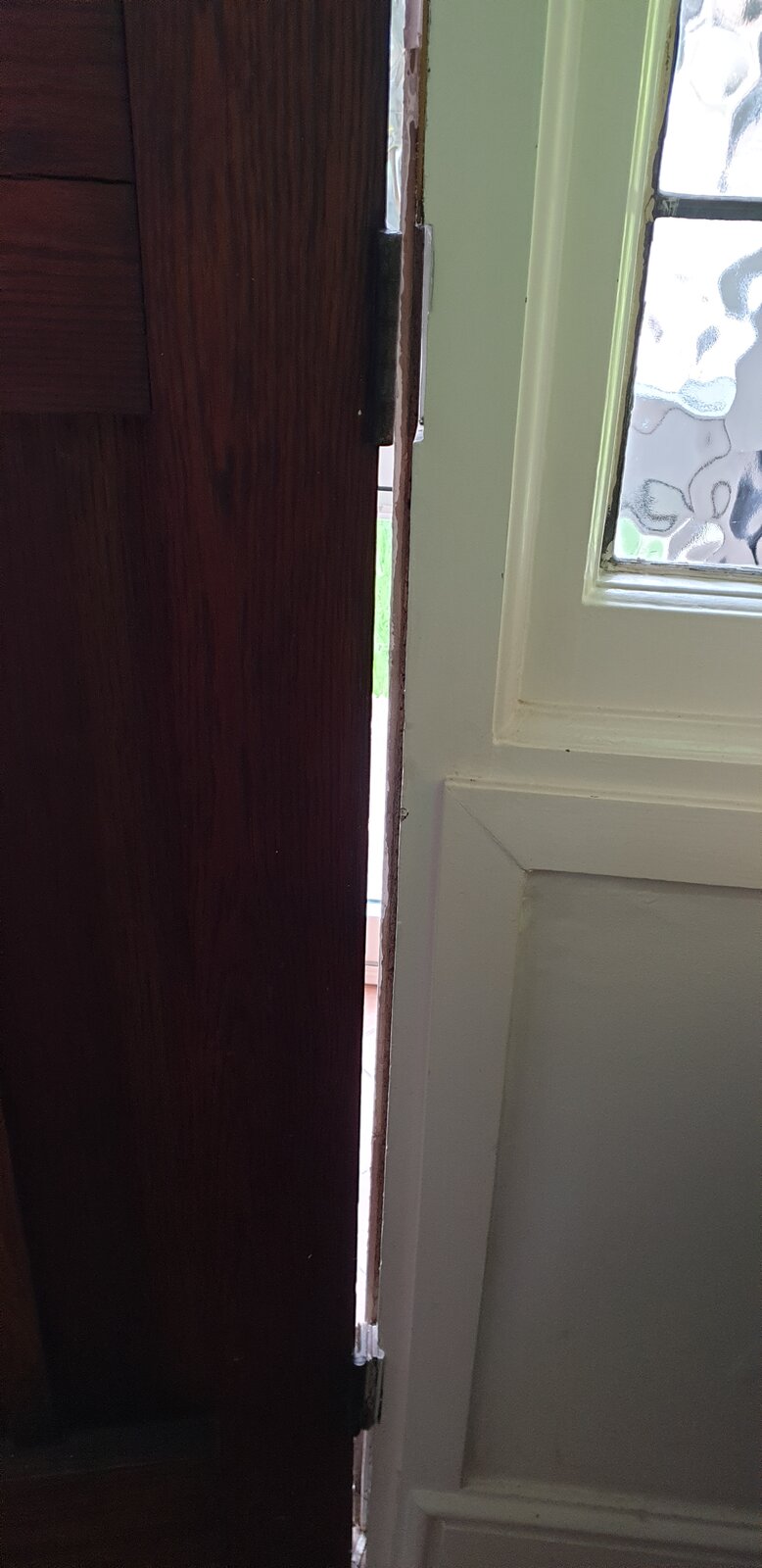 My front door is in a frame that has bowed (subsidence from years ago) with a major gap on the hinge side which starts at 4mm (acceptable) at the very top and gets up to 16mm in the centre and then returns to about 12mm right at the floor. The door has two window lights either side so I don't want to replace everything just now as can't afford it really and was wondering about filling it with some strip wood.