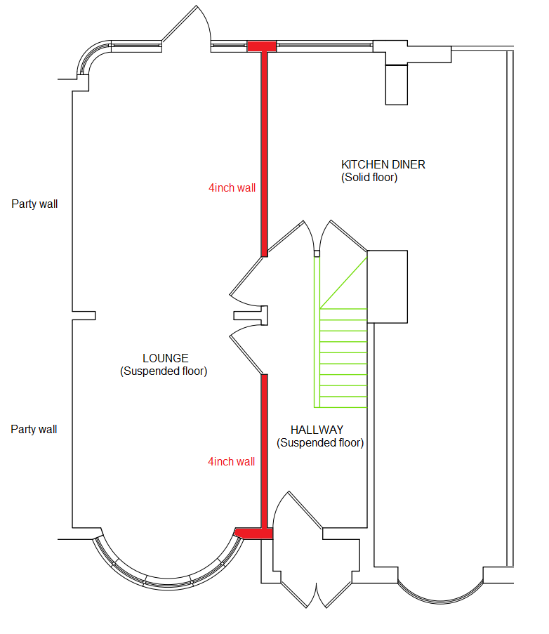 - This second builder showed us that the wall between the solid kitchen floor and the lounge floor is also 4inches wide (same width as the wall next to the suspended floor). His view was that the solid kitchen floor should give assurance that it isn't an issue (because the kitchen floor is against the same width wall as the suspended floor is). The house is unoccupied and bare at the moment so the builder was free to dig a little into the kitchen floor to demonstrate the floor was also against a 4inch wall.