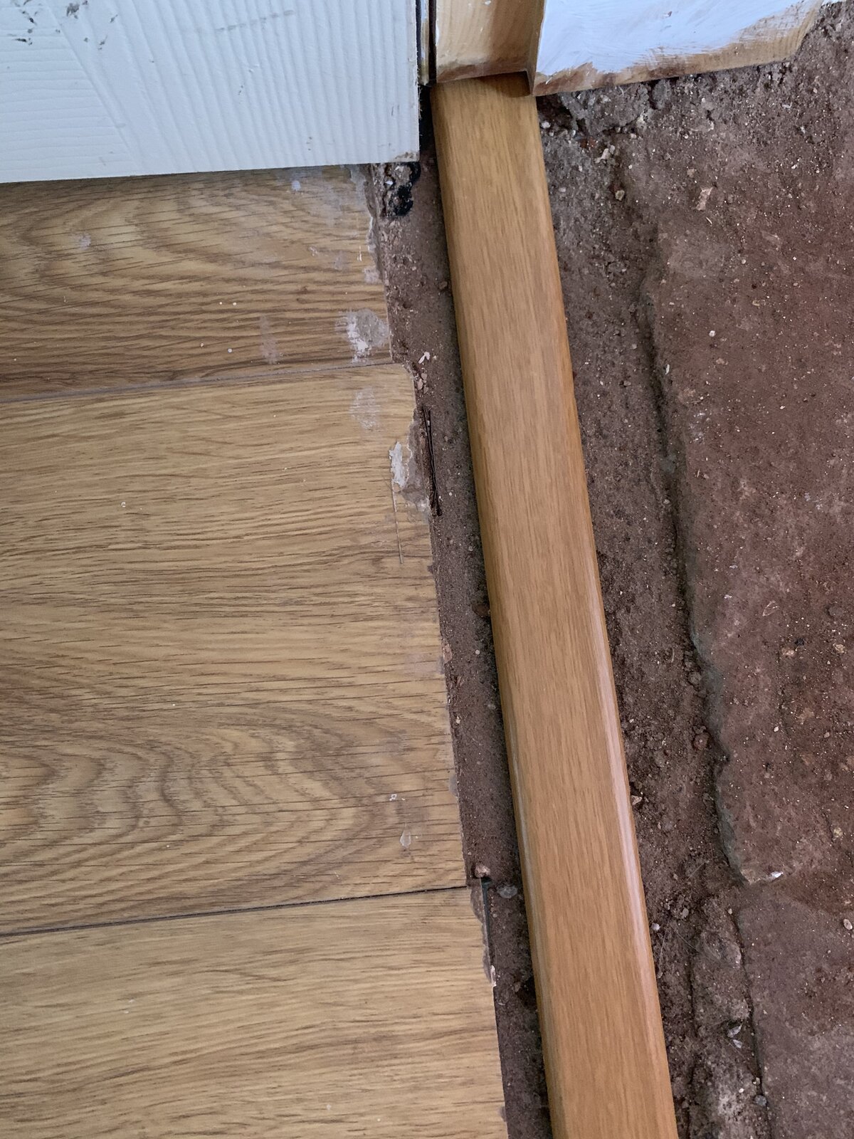 The old laminate flooring doesn’t reach to where the door is meaning there is a gap (around 3cm) between the end of the flooring and the threshold under the door. The pictured threshold isn’t the one we are using - will be matching better to colour of floor.