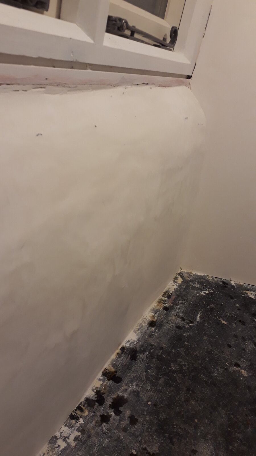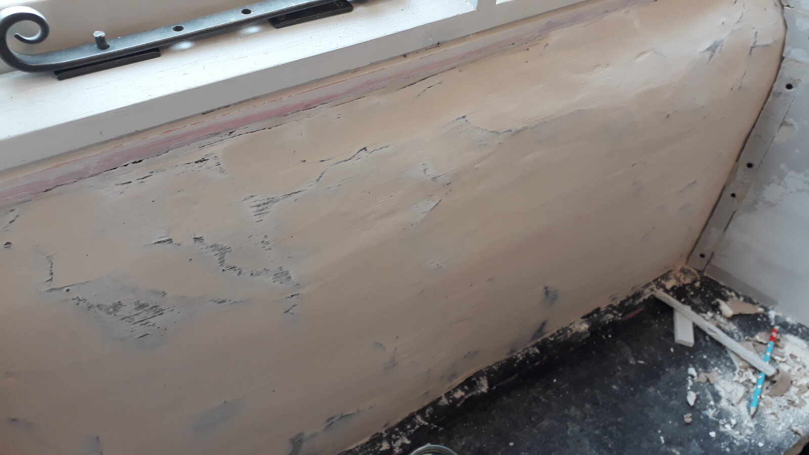 I've been boarding, taping & jointing a small room, using easifill for the jointing & filling. I'm pretty comfortable with that, but am wondering how to finish a small (~1m2) area of curved wall (see pics below). It's got a sand & cement finish, with some kind of tanking on top. What should I use to achieve a smooth (not flat) finish? Can I just go to town with my new easifill skills?