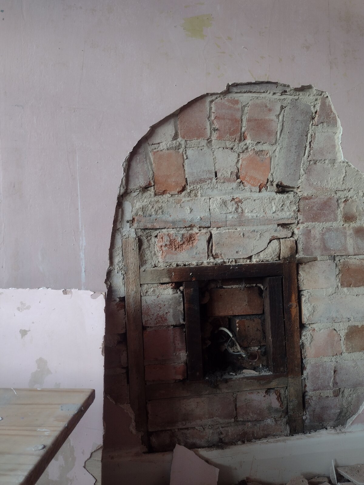 I am currently working on an upstairs bedroom, fireplace wall had a piece of chipboard on it, took it off and then started looking for lintel, is this double row of bricks said lintel? And is it safe to take away all that in the middle? I'm not going to use it for a fire, just prefer it open than boarded but I don't want to cause a collapse!