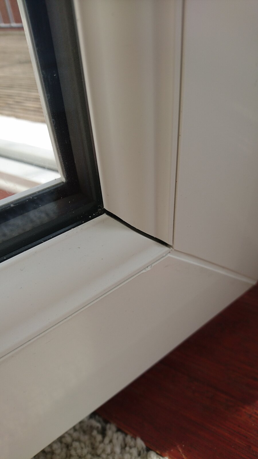 The fitters came and fix the new doors on Tuesday, it seems almost ok. Two questions: 1st: there are "breaks"/space/cracks in between the white thing ( I will call it tape) around the glass in the corners, in a couple of places (as per the photo number 1), this is only on the inside (= so inside the house). The outside corners have been sealed. Are those "breaks" ok on the inside part of the window, or should they be sealed as well or can they be left like this? The 2nd: only today I have notices a scratch on the glass, it is very small - about 2.5cm, this is double glazed window so it is on the outer glass, but somehow inside, so you can not feel it, you can only see it. Is it ok?
