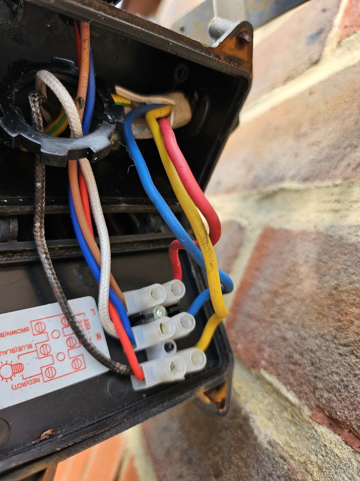 My existing floodlight is an old one which can work as permanent light, or as PIR and so it had 4 cables and not 3. This is the old wiring.