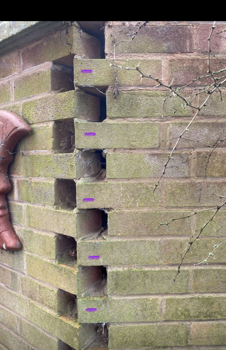 I want to drill and bolt a fence post to the birdsmouthed section of this wall (purple dots) - worth bothering or will any fixing just split the brick as it expands? Better to sister it up next to another one fixed to the solid section instead? Ta