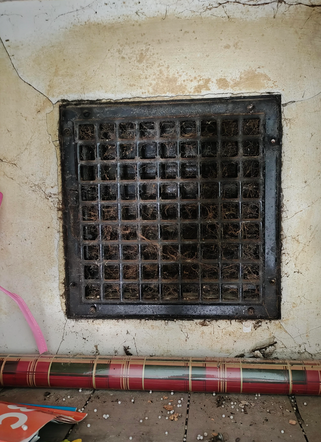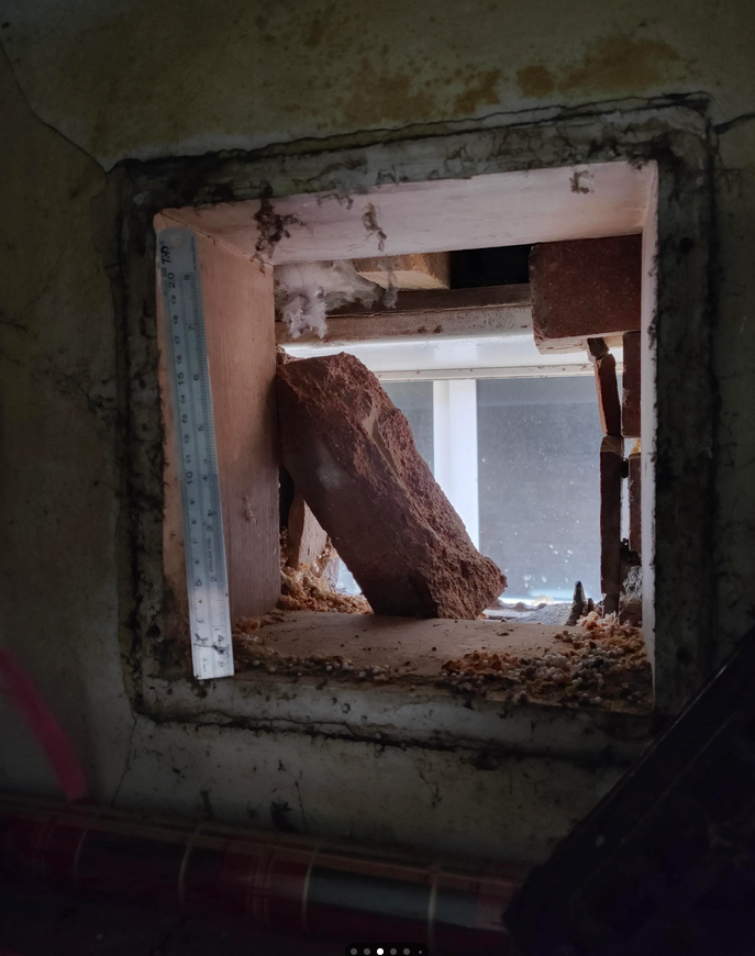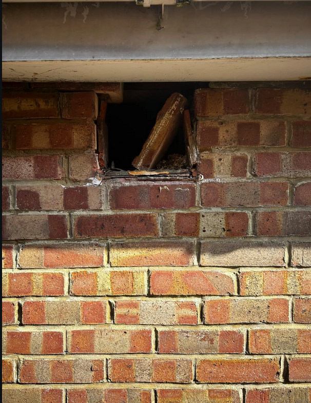 Our neighbour let us know that an outside vent on our house had fallen off. It's an awkward location to get to as there's no direct ladder access underneath. I can access the other side of the vent in a cupboard upstairs, so I'm wondering if this is something I could fix/replace from inside? It also seems quite big to me and doesn't have anything between it and the cavity, not sure if this is normal? The location of the vent in the house is close to where an old fireplace used to be, which I'm not sure is related.