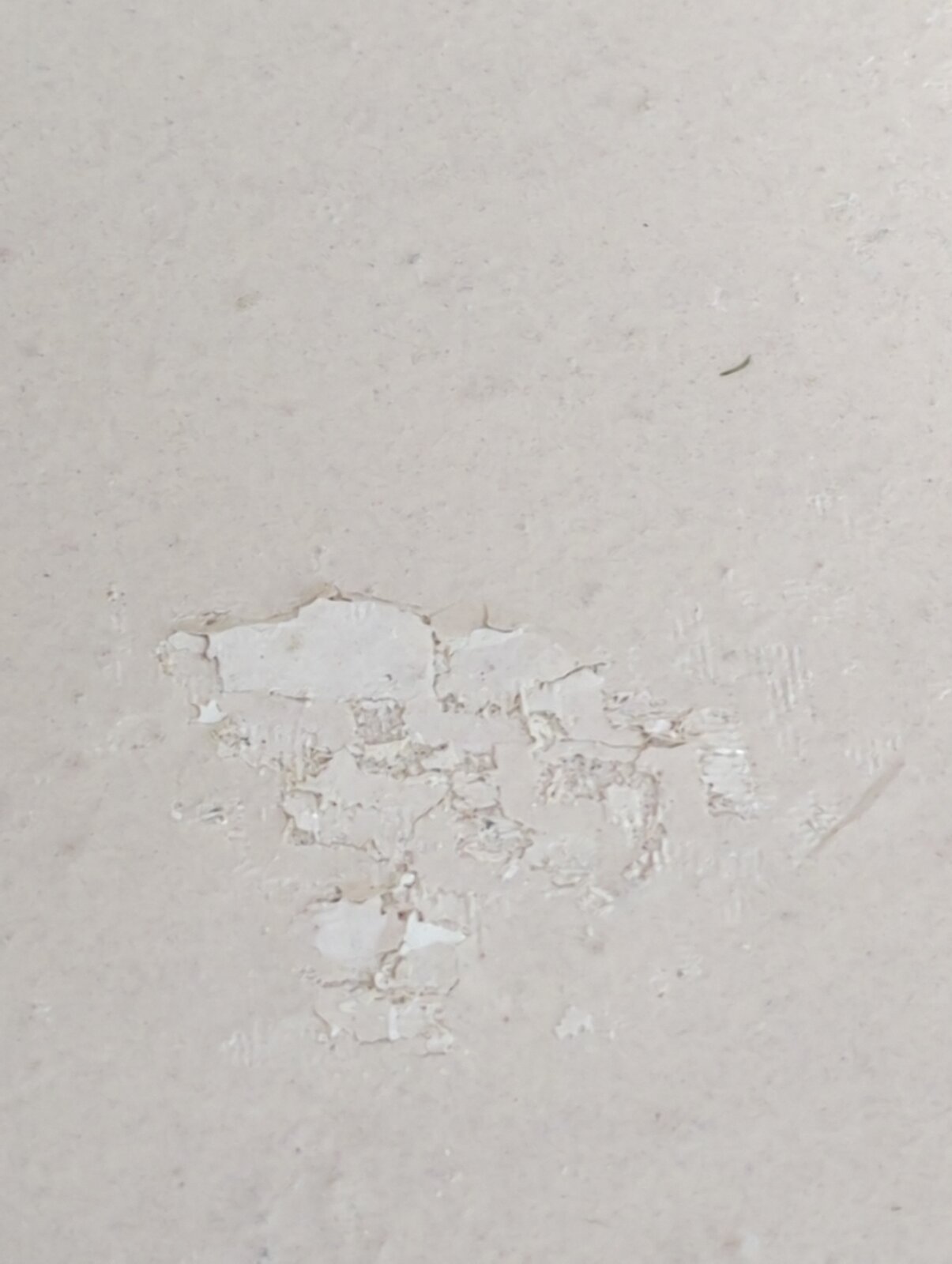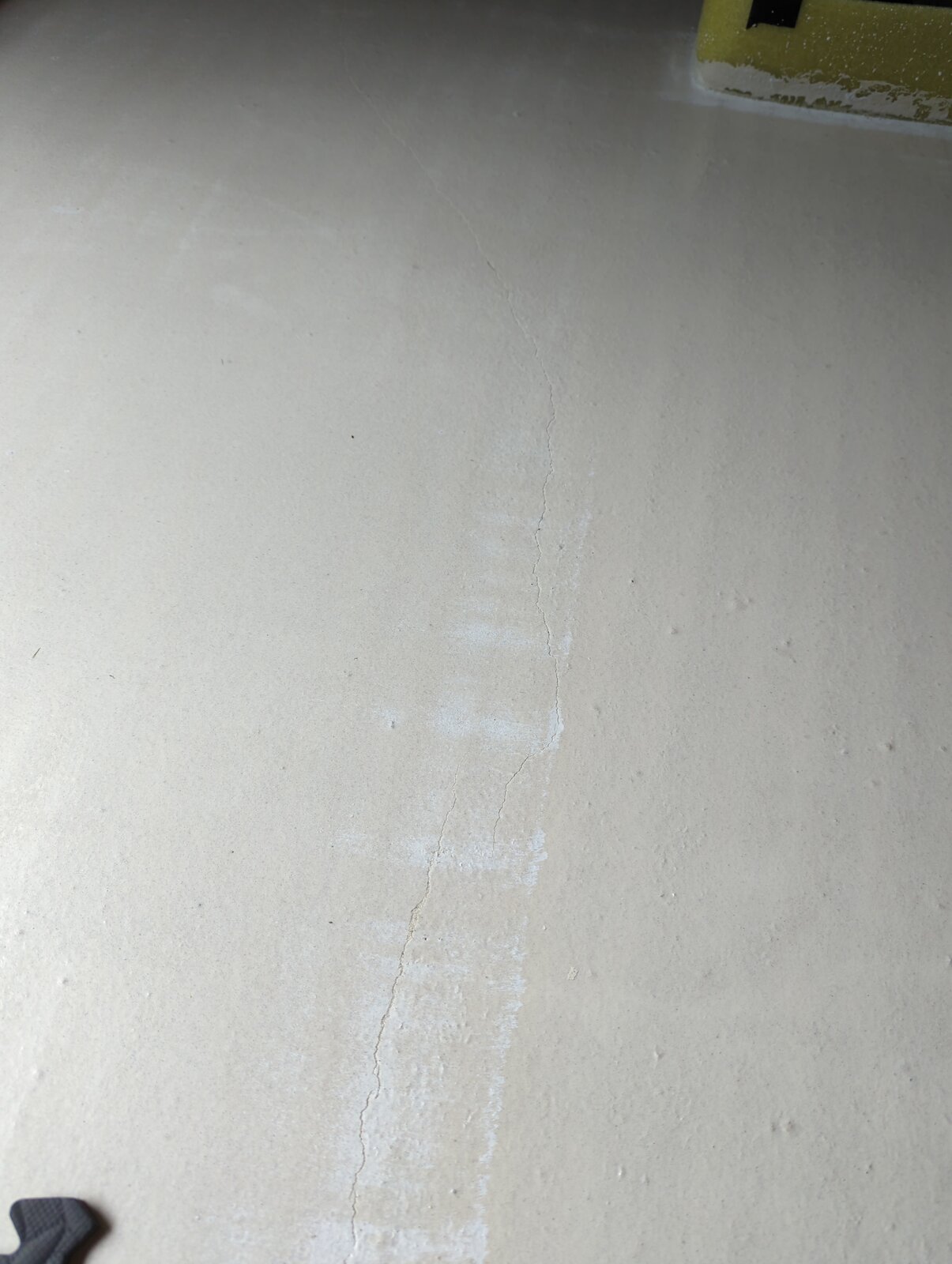 I walked on it earlier, and very top layer, I guess 1mm maybe less, in places a bit flaky / not set. Also odd non straight crack but they see thin.
