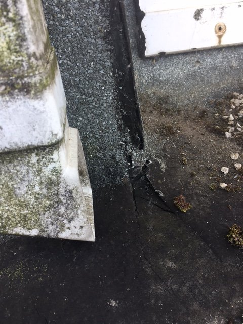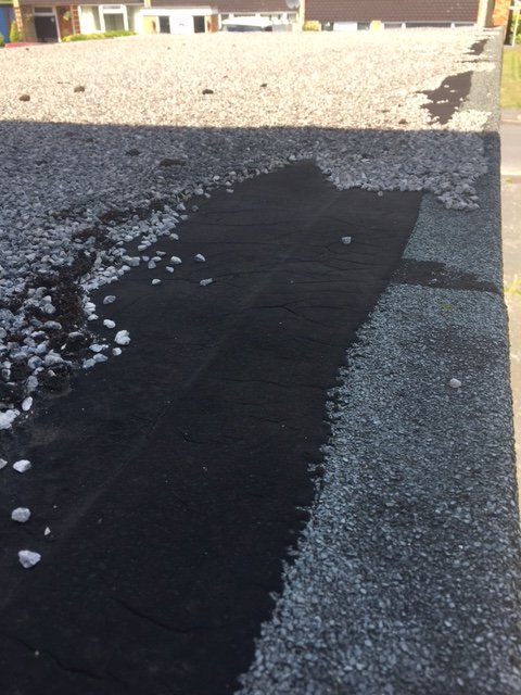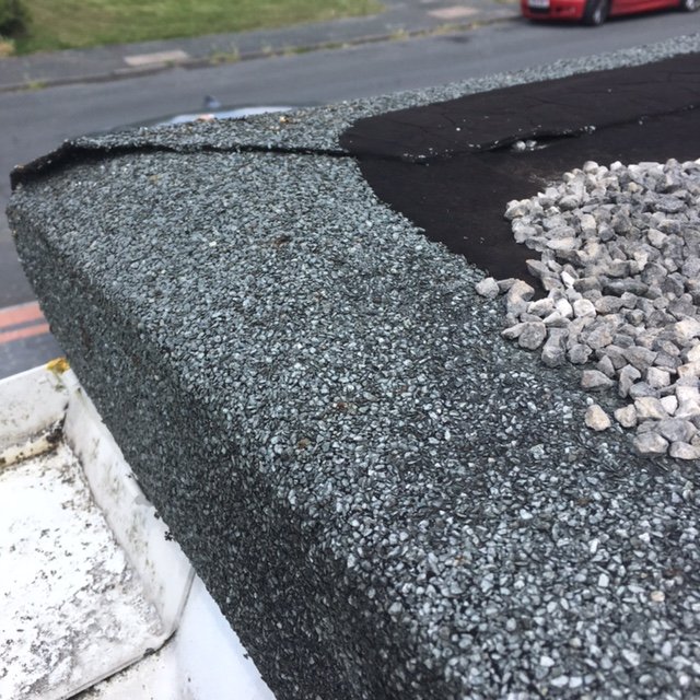 Looking for some advice. The front garage in our house was converted to a bedroom about 10 years ago. The flat roof on the room was presumably done at the same time with felt roofing and grits topping. A leak has now started in the corner where the rain water from the main roof lands on flat roof. I have checked the flat roof today and their is a wide crack in the felt at the corner with the vertical face. In general the grit has been lost all along the edges with many cracks and couple of blisters. The rest of the roof appears to be in good condition. Attached are some photos showing failed corner and general condition.