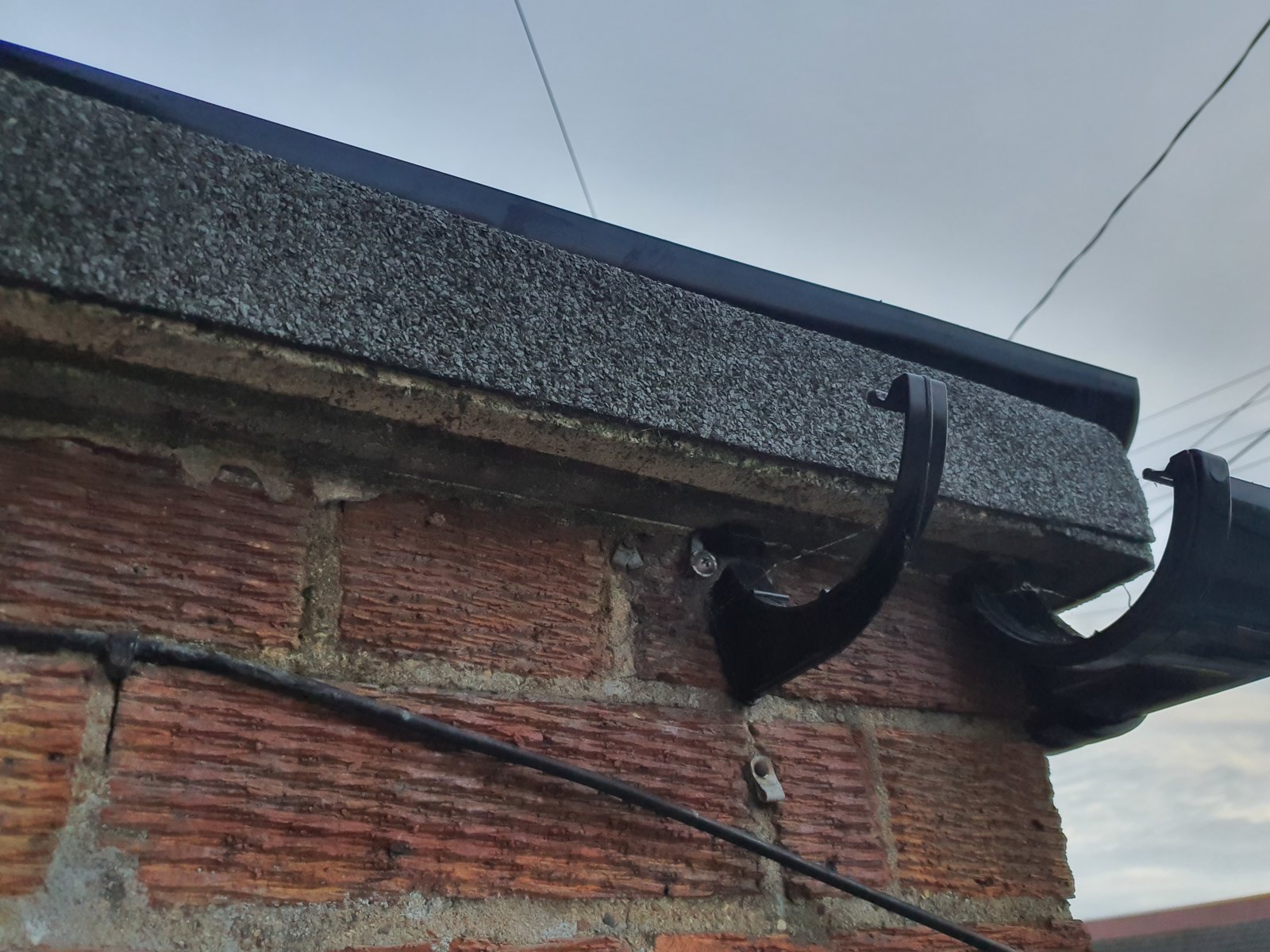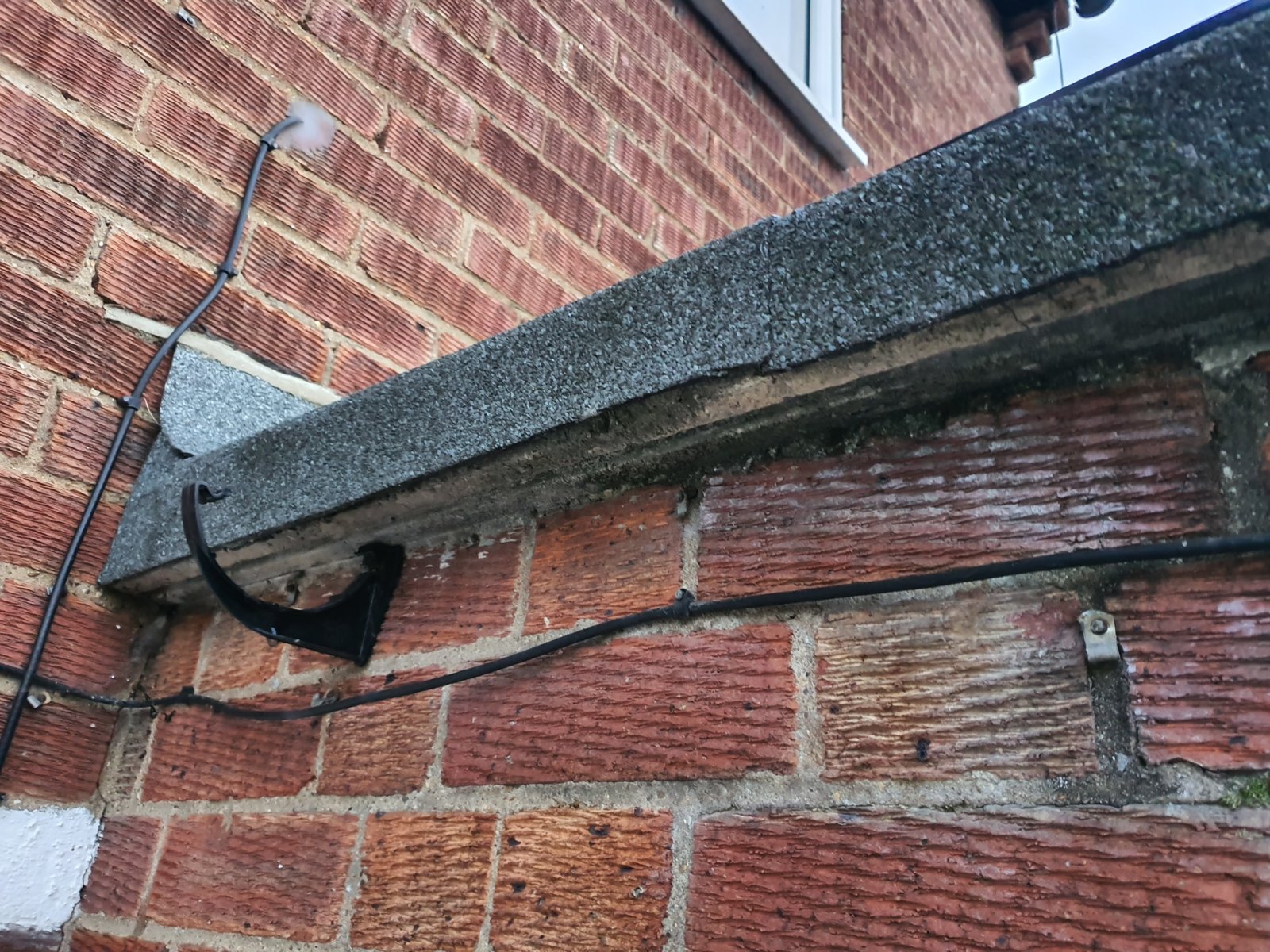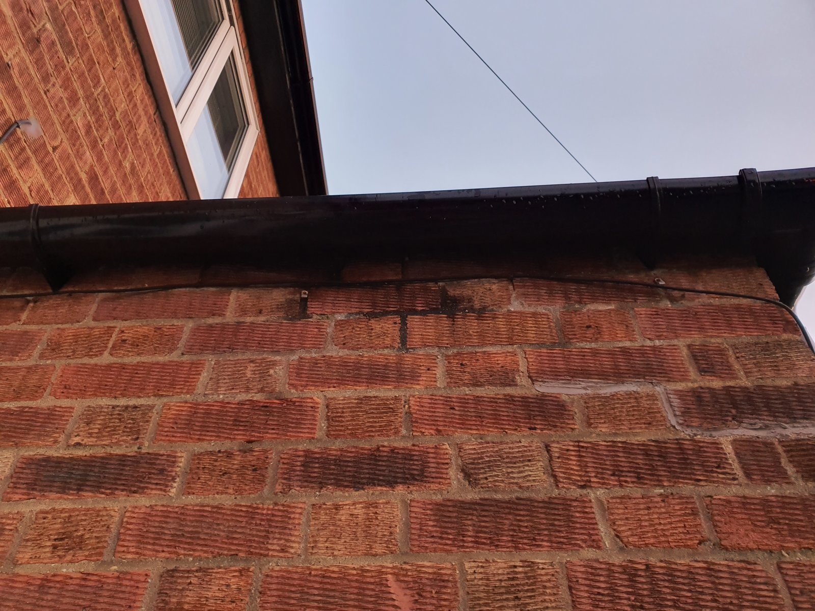 On the right hand side of the guttering in the picture, the gutter bracket does seem to be right up to the concrete edge which cant be helping but doesn't seem wet there.