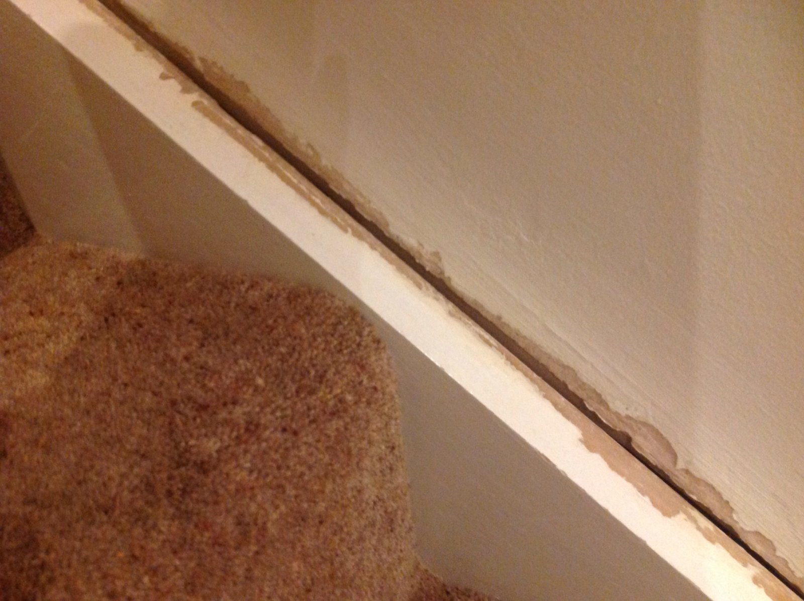 How could this problem be fixed so the wall doesn't move so much and cause the caulk to crack? One idea I had is to screw through the side board on the staircase into the studs, but any other ideas would be appreciated. I'll attach photos (in the photos I have removed the caulking)