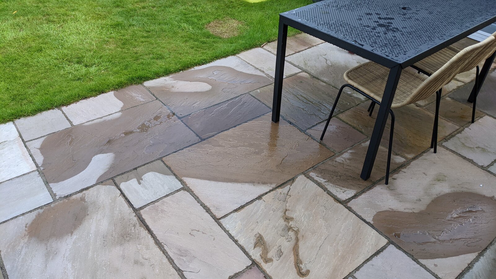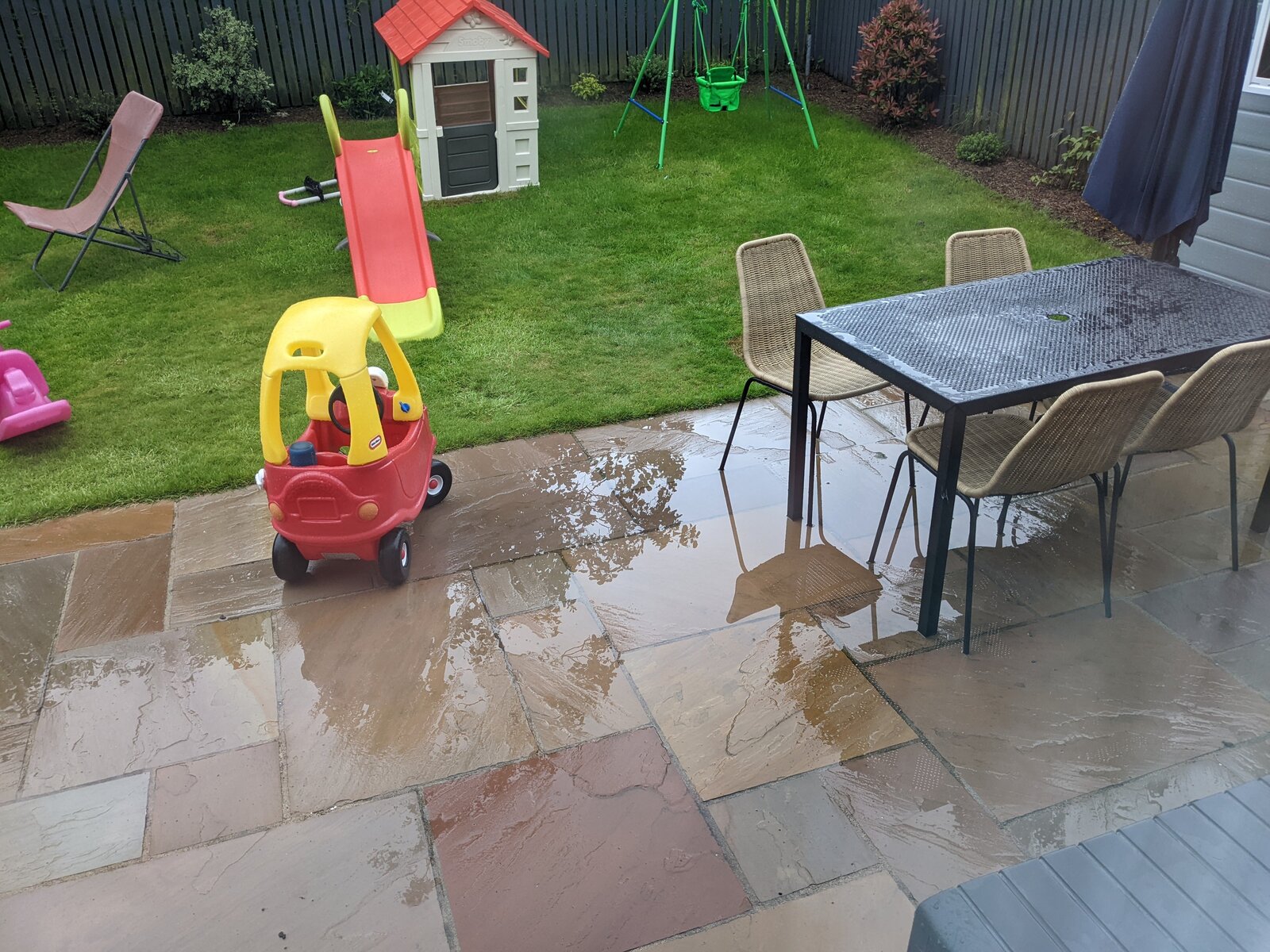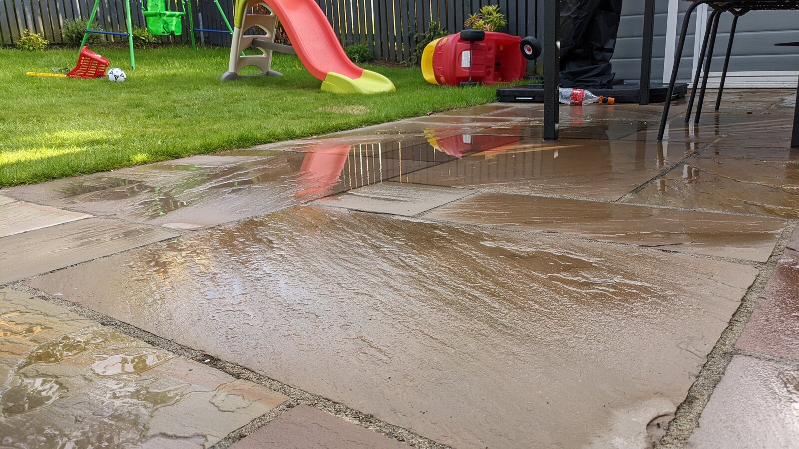 New slabs and patio was installed last year. It has been OK until this summer where it seems that some slabs have sinked creating a small area of the patio (below the table, in the pics) that now gets flooded when there is medium rain (very often where we are!). Trader is clearly rogue and seems to have gone out of business. Any solutions to this? Is this the trader's fault? Is it feasible to raise the affected slabs, put more concrete below them creating slope, then laying them down again? I have also been told about injecting polyurethane foam, is that a thing?
