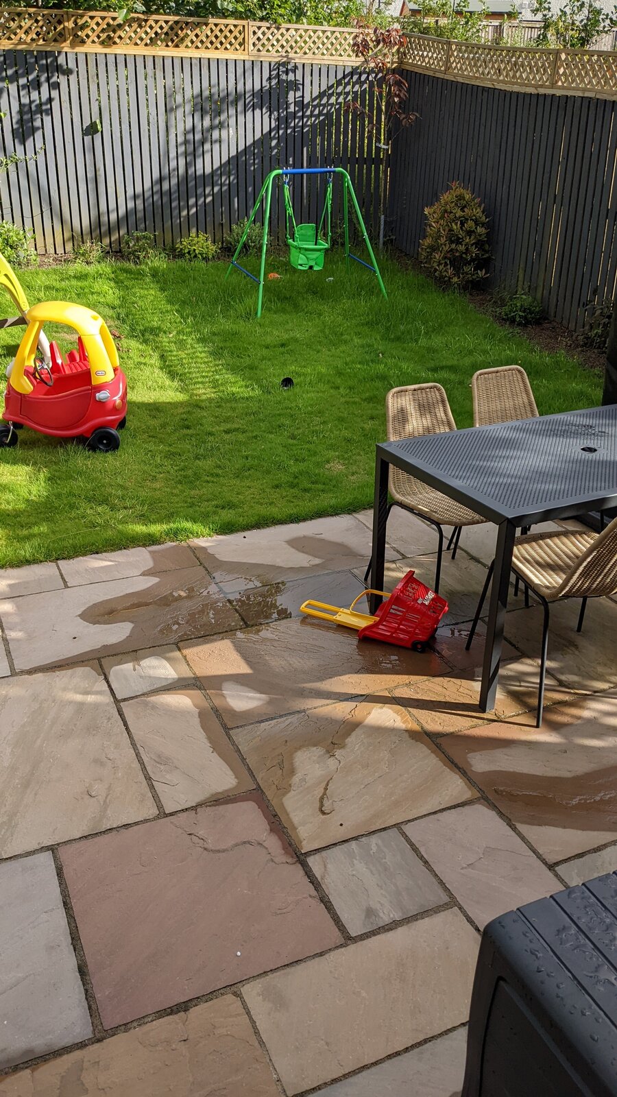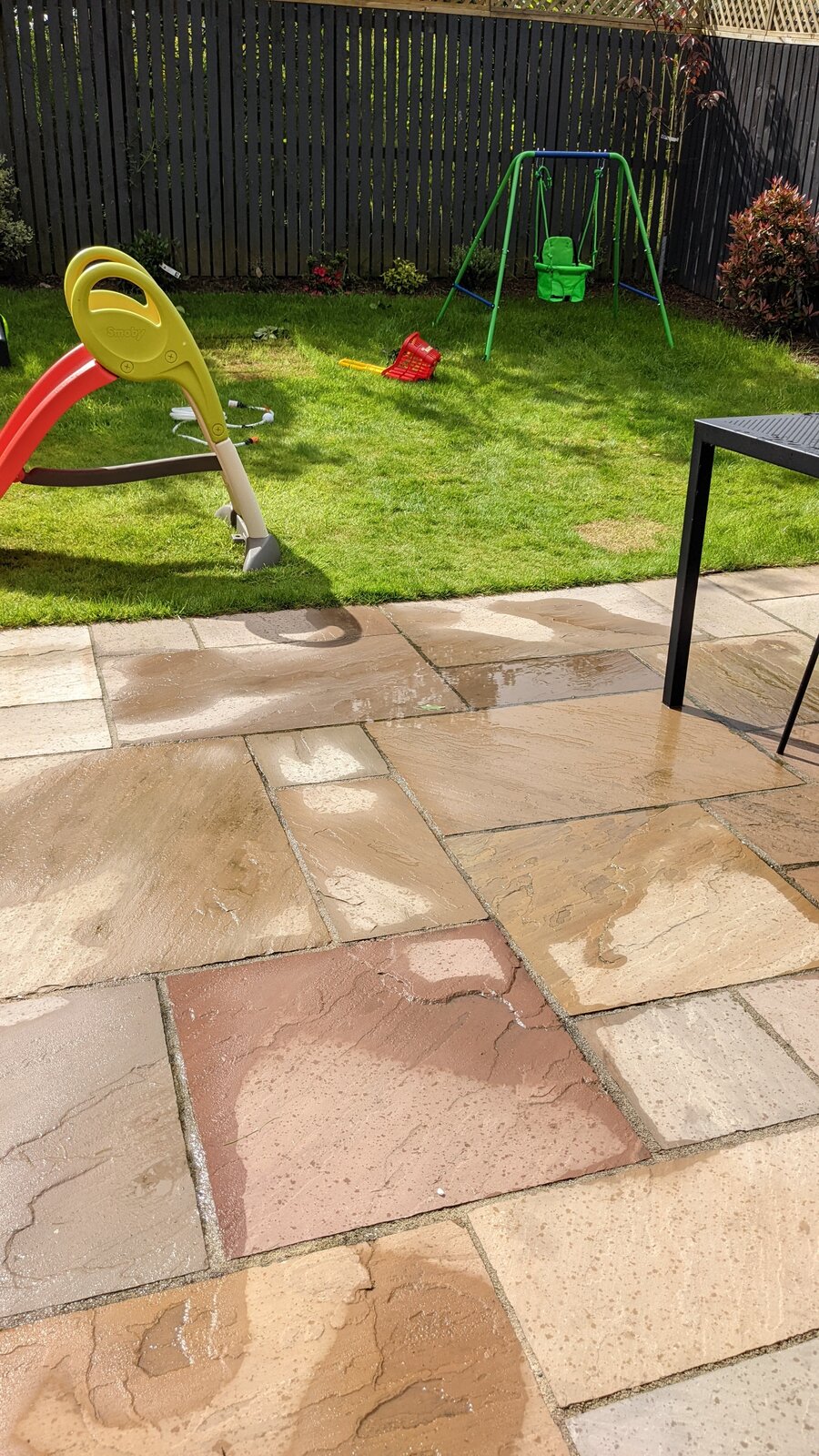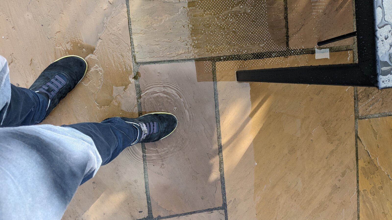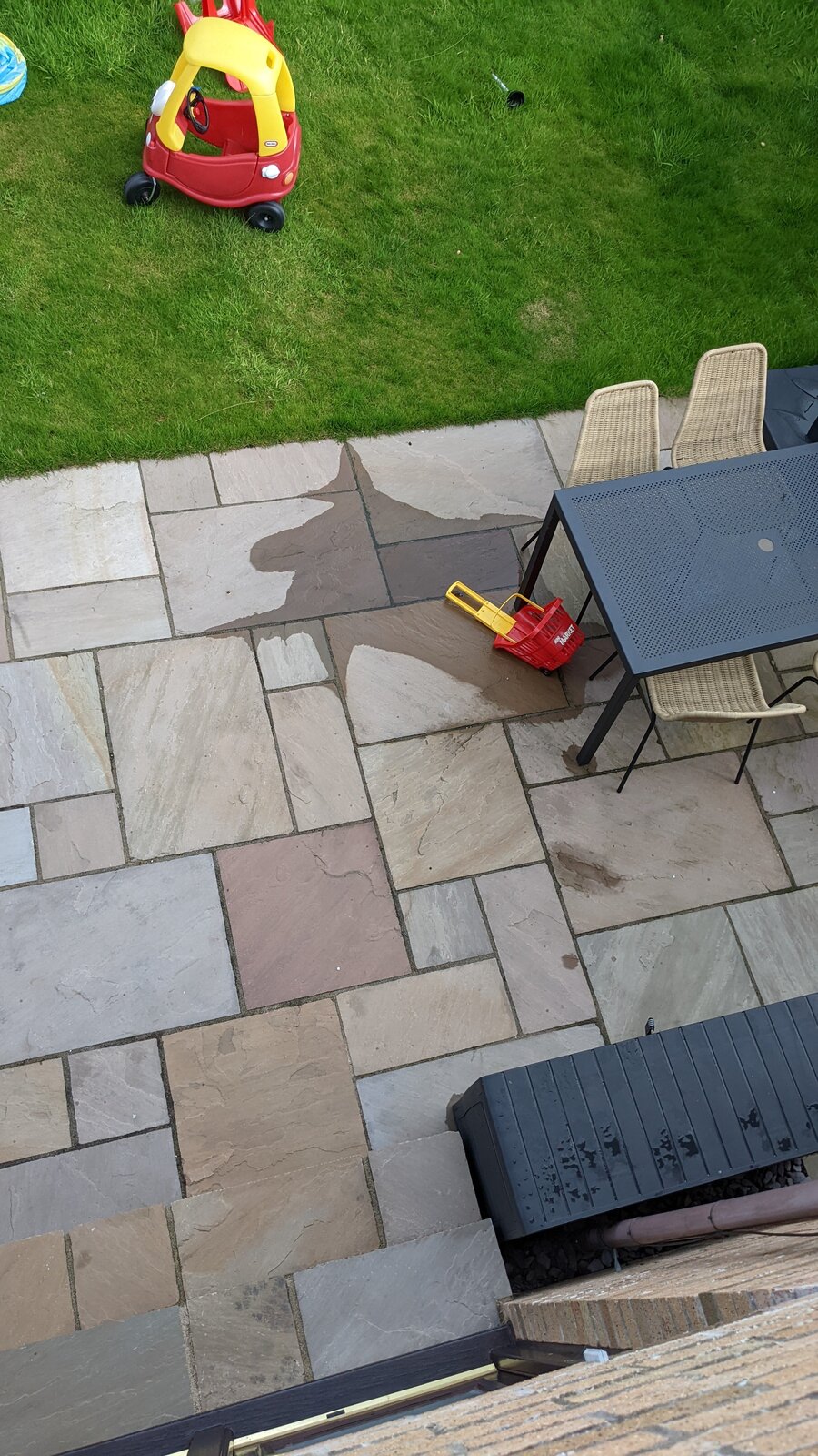 New slabs and patio was installed last year. It has been OK until this summer where it seems that some slabs have sinked creating a small area of the patio (below the table, in the pics) that now gets flooded when there is medium rain (very often where we are!). Trader is clearly rogue and seems to have gone out of business. Any solutions to this? Is this the trader's fault? Is it feasible to raise the affected slabs, put more concrete below them creating slope, then laying them down again? I have also been told about injecting polyurethane foam, is that a thing?