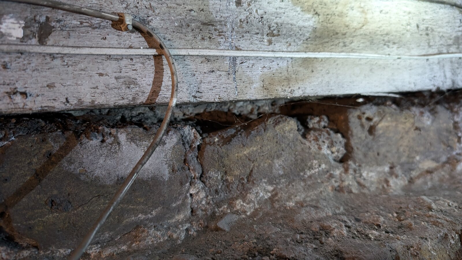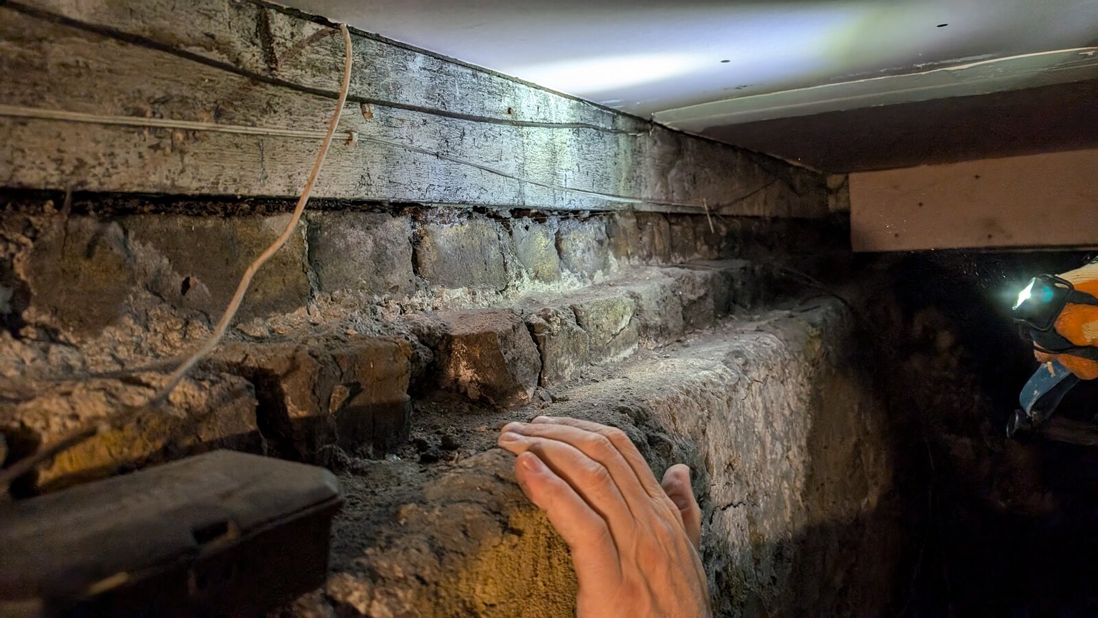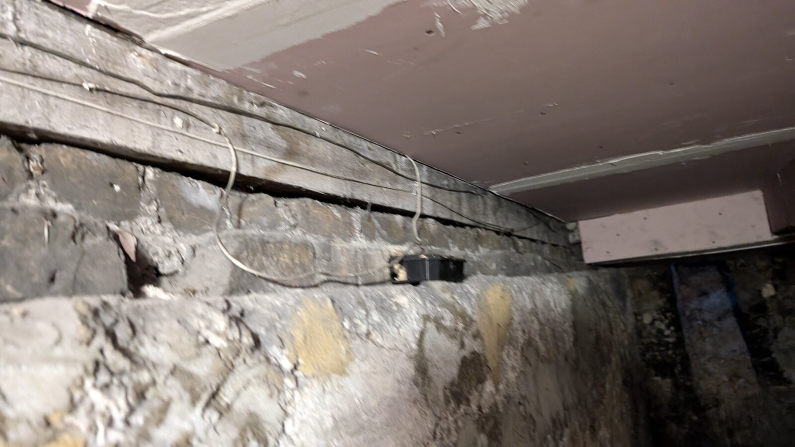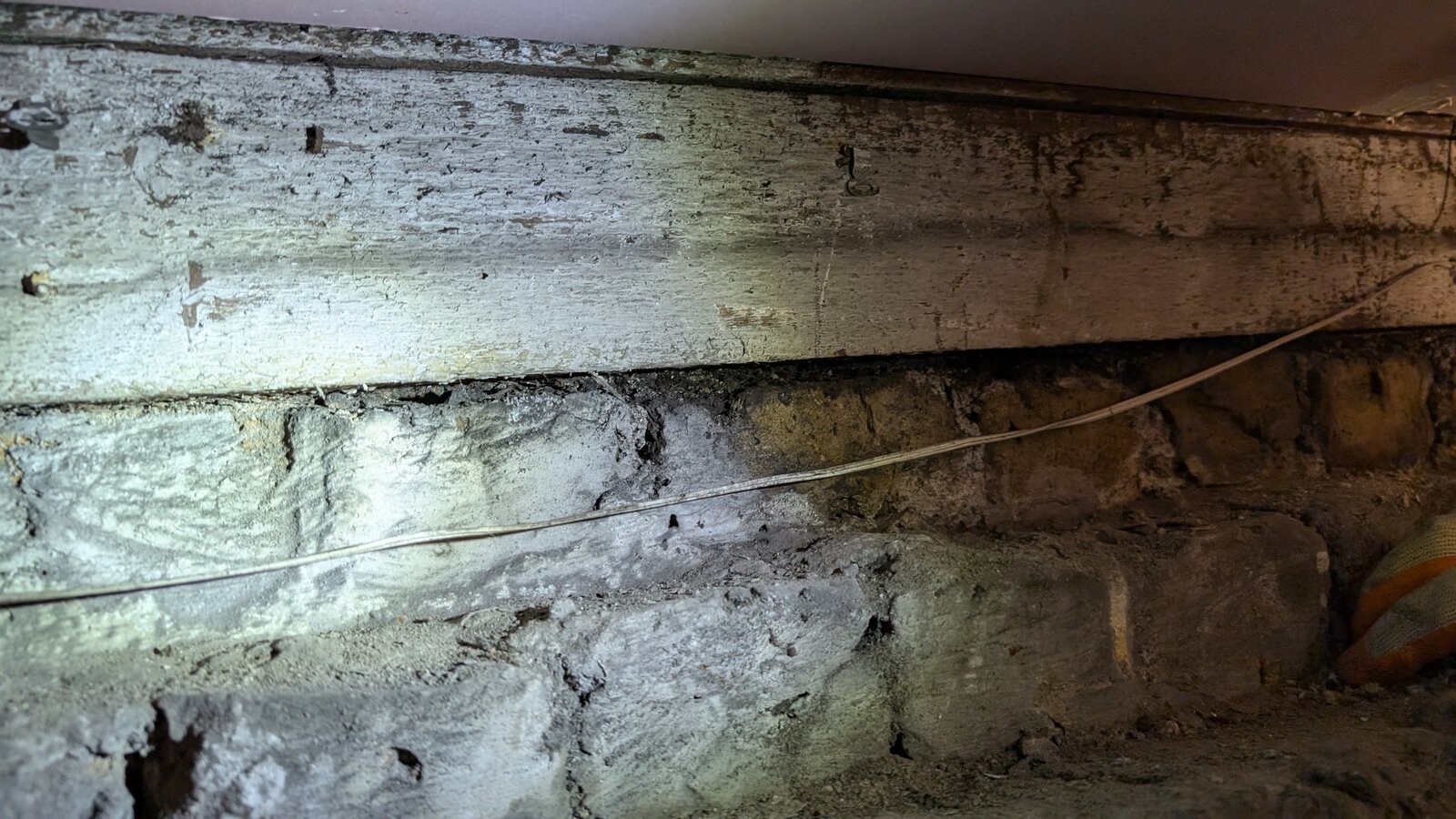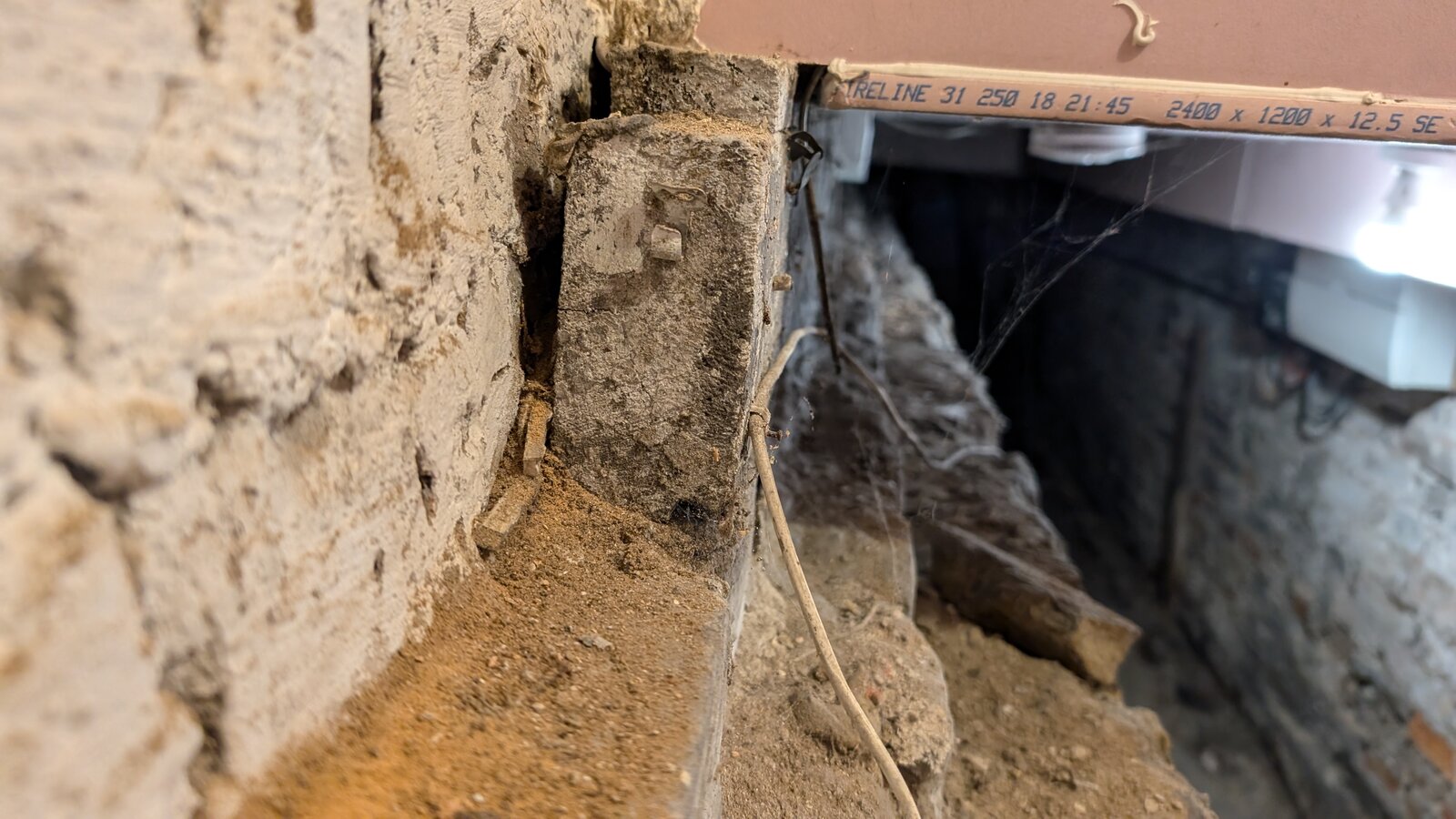 Went to the basement to check the state of things recently (rarely go there..) and along crumbling render on basement walls to be re-done I noticed this floor joist which in most places does not rest on the wall anymore. For one moment I could not believe it is mean to be supporting / structural for the floor but someone went in the corridor and jumped on floor and first step of stairs and that beem moved up and down