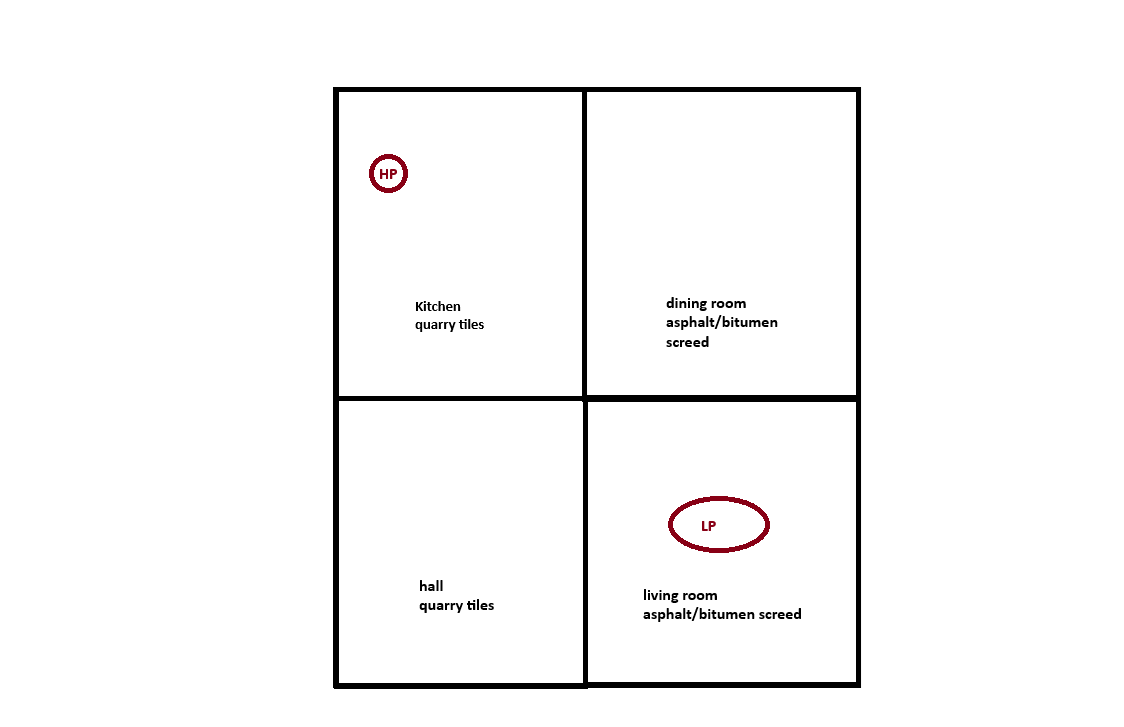 - Currently, in the kitchen and hall, there are quarry tiles with no dpm underneath, while in the dining room and living room, I have brownish screed (I guess bitumen mixed?). I've found I can put Arditex NA directly on quarry tiles, but the difference between the highest and lowest point on quarry tiles is about 30mm, which is too much for Arditex both in terms of manufacturer's recommendation and, more importantly, the cost. So what would be the best approach to level it?