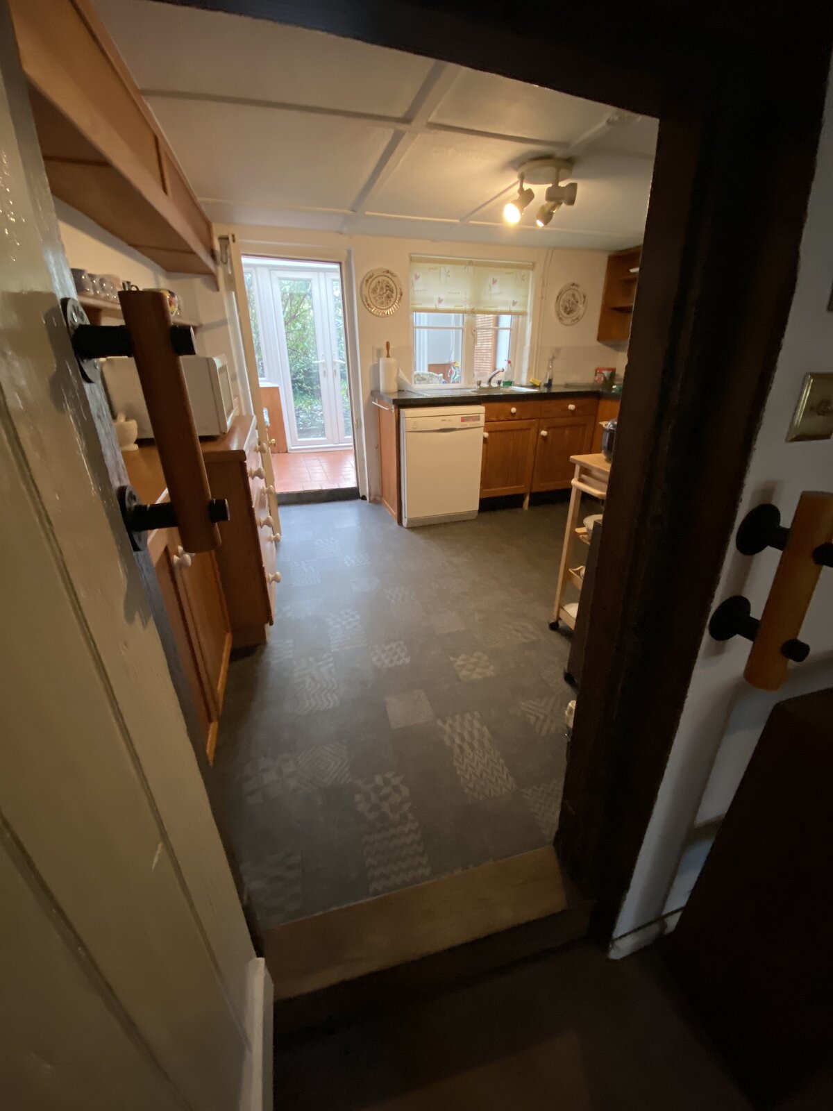 Just a general question of roughly how much work would be require to level this floor throughout this cottage. It would be lowering the kitchen floor & lean to (5x5) to the same level as living room.