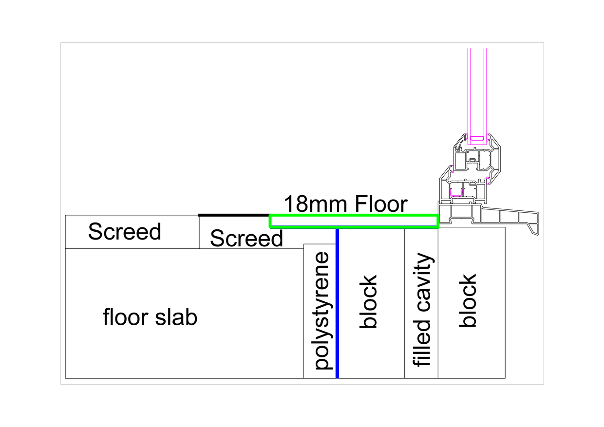 As you can see the blocks are below DPC and the cavity has been filled too. The DPM comes up the inside of the block and that is my damp barrier (blue line). If I just scree to the front door then I won't have a DPM and also I'll scree over polystyrene so likely the scree will crack there. The only solution I can think of is to let in a bit of 18mm chipboard flooring. I just about have 18mm below current screed high point and I'll be using levelling compound at the end as the floor's not so flat anyway.