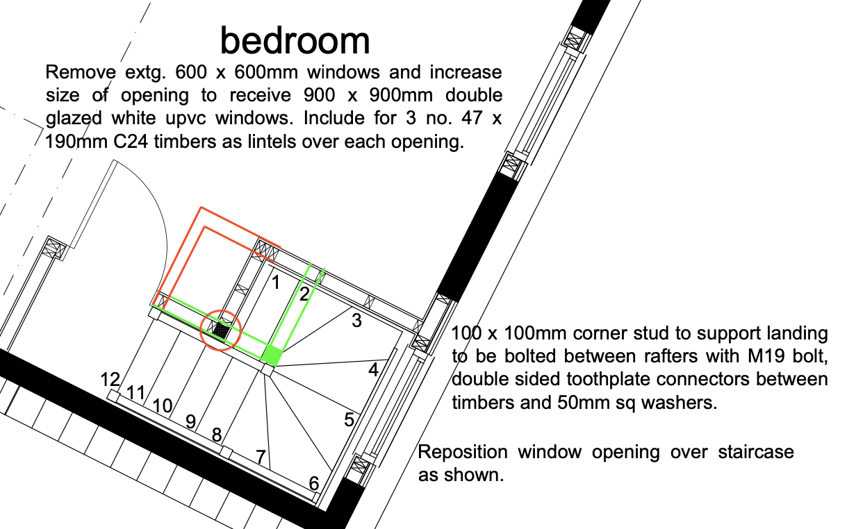 Our architect, who unfortunately has gone awol had previously specified that we could install the new staircase and then increase the floor coming out over it by using a 100x100 corner post bolted to the rafters above to 'hang' a new small area of floor (1-2m2, none of my sketch is to scale!) above the new staircase. When we have now looked at this, the suggested corner post would finish directly in the middle of two rafters. So the question is, could the same design be used to 'prop' the floor instead of 'hang'? We would have doubled joists on hangers from the post which would also be bottled to newel post for new staircase.