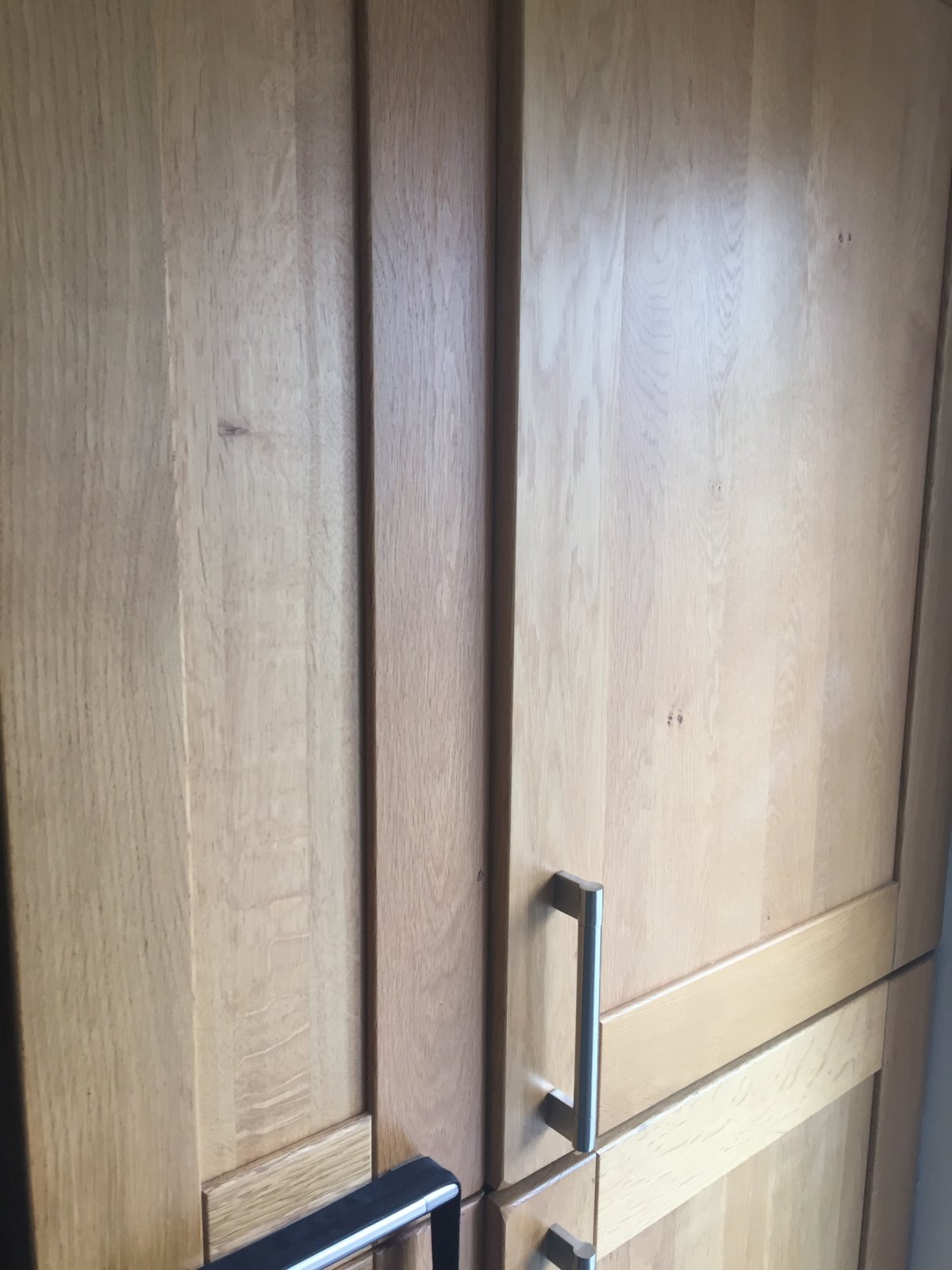 We have just had the boiler replaced in our kitchen (£££!), and as the new one has been mounted on a different wall, it has become apparent that the old one was holding the side of the kitchen cabinet tight to the wall. As a result, I now have two floppy doors which are over lapping another taller one, meaning that we can't get everything closed without a bit of force. How can I go about fixing the side of the cabinet tight to the wall so that everything closes flush again?