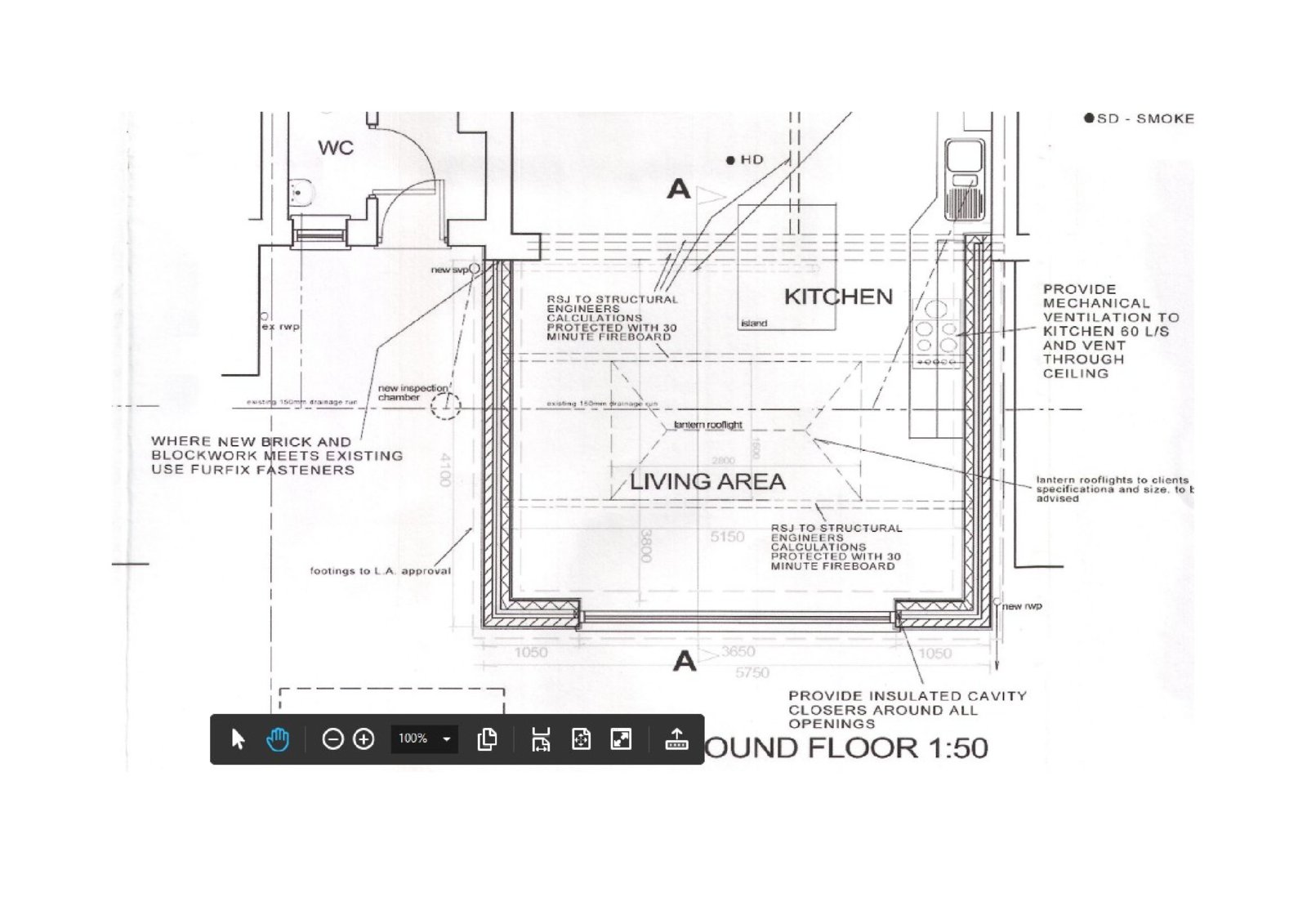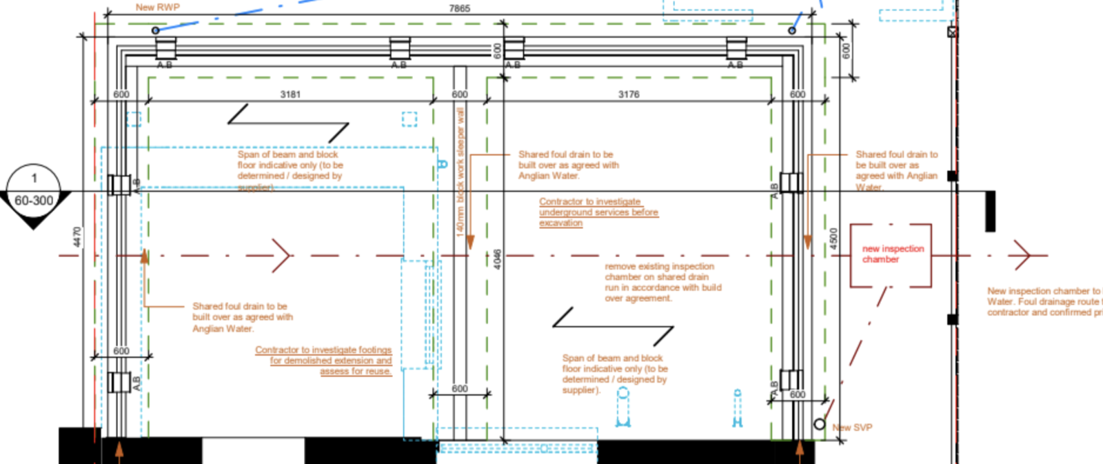 The extension would be over a public sewer (blue), therefore I need a build over agreement. I have decided to have the manhole moved to form a new y junction onto the main public sewer.