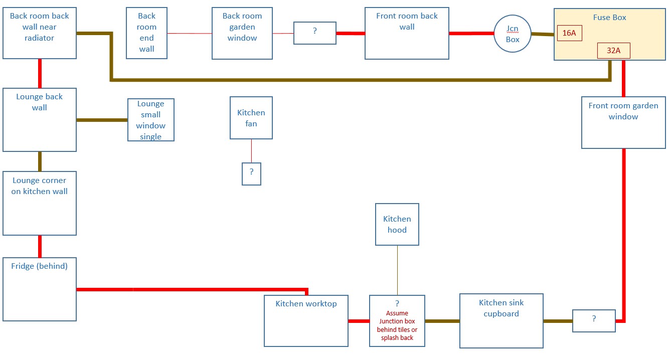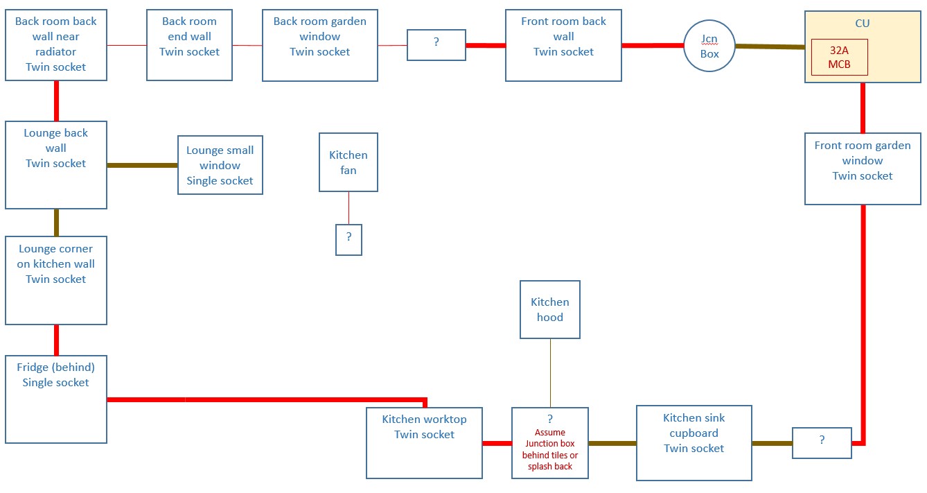 The other half I could run a new 2.5mm back to the CU (there is a relatively easy route for this), and make it into a 32A ring to carry the rest of the sockets including the kitchen appliances.