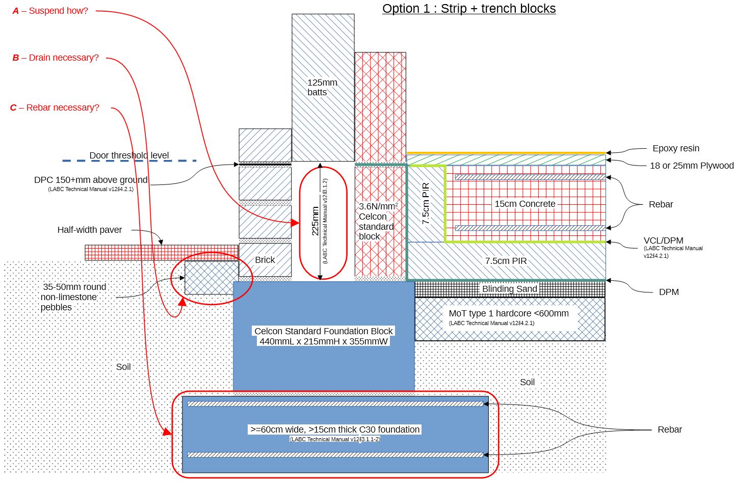 After being told my first idea was doomed to failure, I've come up with two alternatives, the first comprises a minimal strip and foundation blocks, and the second is a full fill trench. Building will be an unattached outhouse, non-Building Controlled, 3m tall brick-and-block home gym, with no drains or utilities nearby.