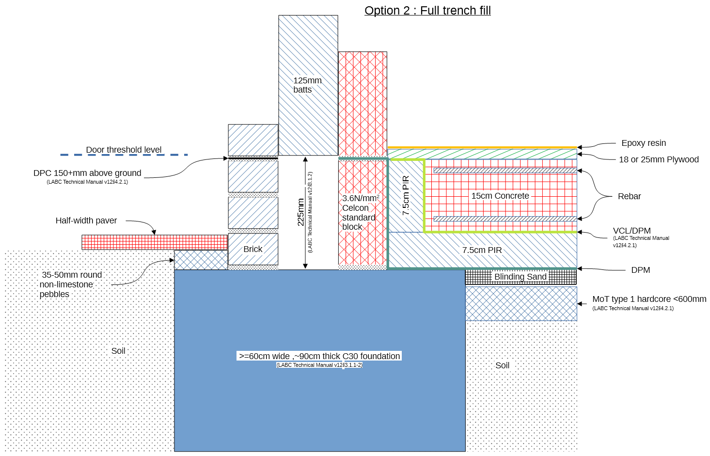 For a full-fill trench, how high should I fill? I'm considering 10cm below ground level, or 225-300mm below DPC. Is that sensible? In accordance with unofficial BC advice, trench will be at least 1m deep.