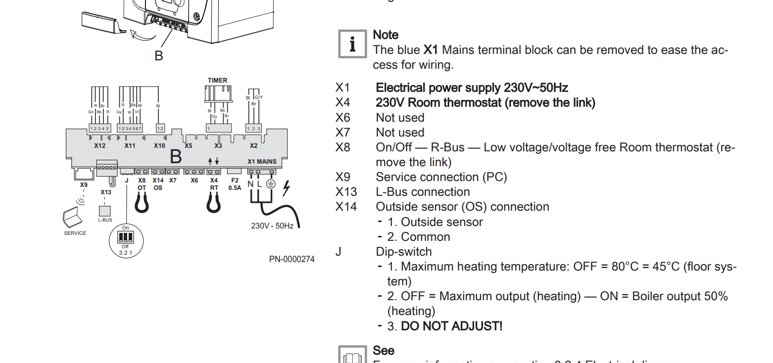 The little red link in X4 is removed and the two thermostat wires connect to the two vacant terminals. The little drawing on the boiler shows the switch of a remote thermostat.